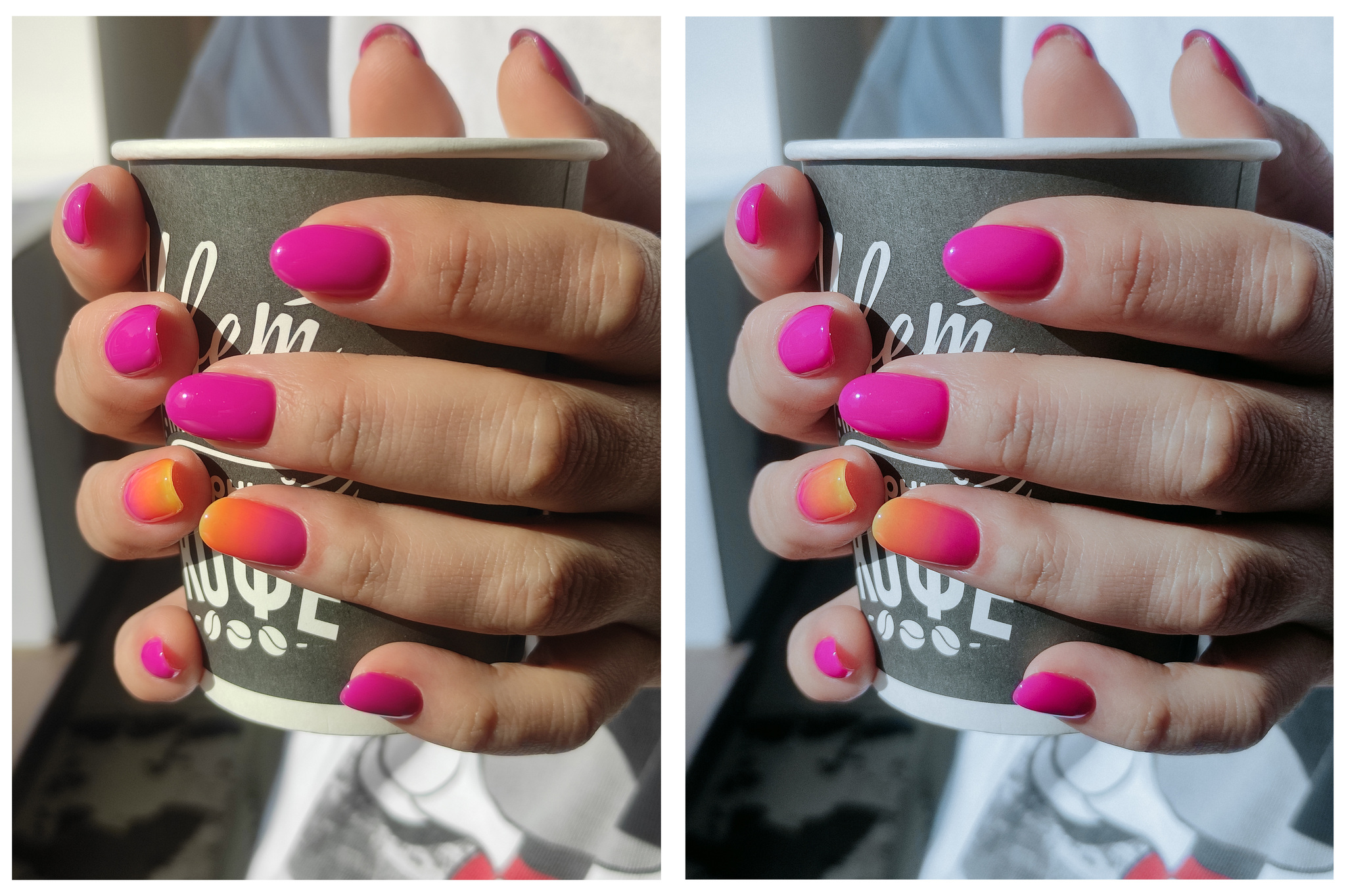Для примера другая фотография, обрабатывал для странички мастера по маникюру. Фотка с мобильного, но уже православный андройд. Мне хотелось добавить некоторой «журнальности», поэтому так же накидывал на изображения «плёнку» (до – после):
