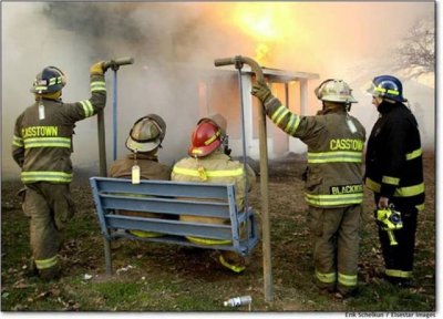 Пожарная часть. Пожарные сидят "забивают козла" в домино. Неспеша входит, покуривая, начальник. Несколько минут смотрит задумчиво на них. Собираясь уходить: