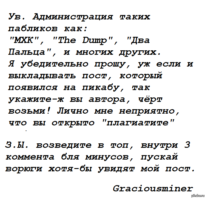 30 GraciousMiner Обращение к администрации пабликов ВК. 11 лет назад [моё] Плагиат ВКонтакте Админ The dump Пальцы Мхк