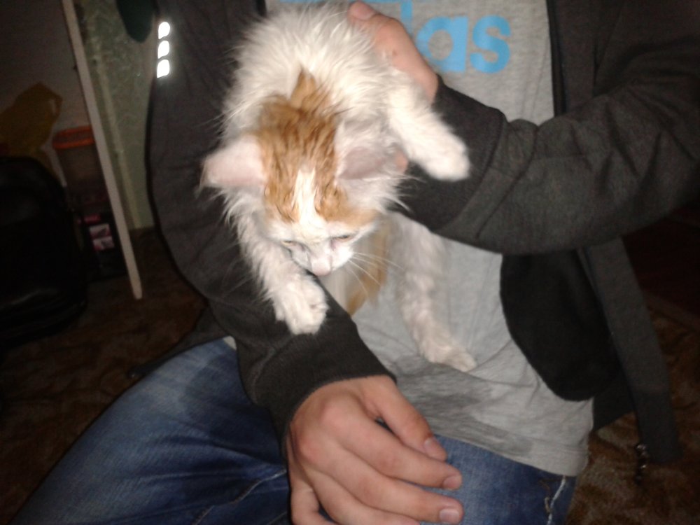 Сегодня в подъезде нашли котёнка, симпатичный, пушистый и напуганный)У себя оставить нет возможности(студенты на съемной квартире, хозяйка оставить не позволяет