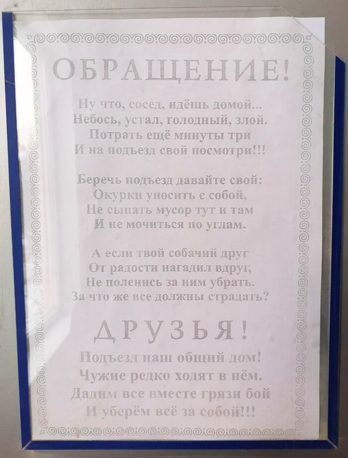 41 Doctor.Pepper 2 года назад Юмор для всех и каждого Обращение к жильцам в стихах [моё] Юмор Жизненно Соседи Объявление 1 Ещё 0