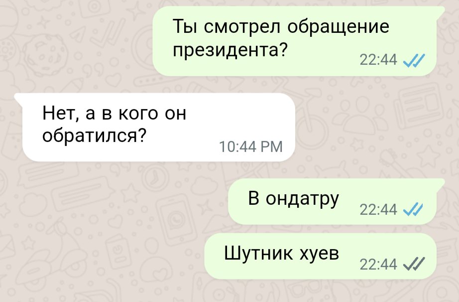 4950 toptomysh Специфический юмор Юмор Обращение президента 8 месяцев назад Скриншот Переписка Обращение президента Юмор Мат Повтор Игра слов 204 12 6 2 1 Ещё 0