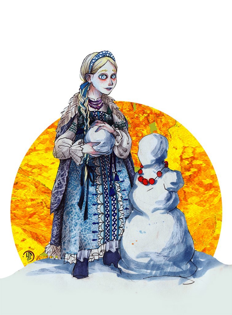 Персонаж русского фольклора, ребенок, созданный из снега. Вероятно, образ Снегурочки был исконно связан со сменой сезонов и связанными с ними смертью/воскрешением природных сил, по аналогии с Купалой и Костромой, но впоследствии персонаж из мифологического стал исключительно фольклорным. Согласно сюжету, Снегурочка представляет собой снежную бабу, одушевленную и превратившуюся в живую девочку. Свойств снега она, однако, не теряет, а потому тепло , огонь, а в некоторых вариациях и солнечный свет для Снежевички губительны.