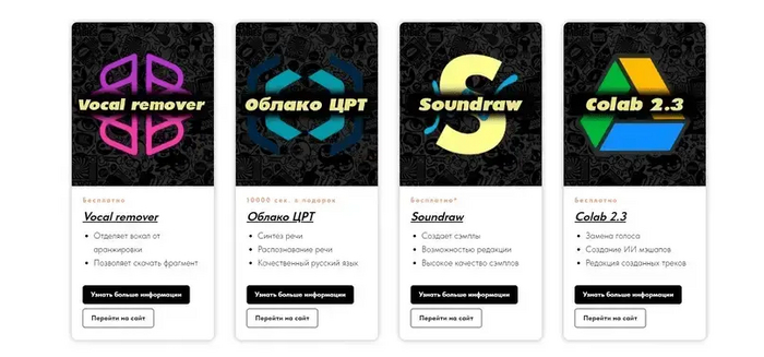 2. В каждой категории вы найдете карточки с информацией о нейросетях, включающие их стоимость, назначение, основные функции, а также ссылку на официальный сайт и кнопку для получения дополнительной информации.