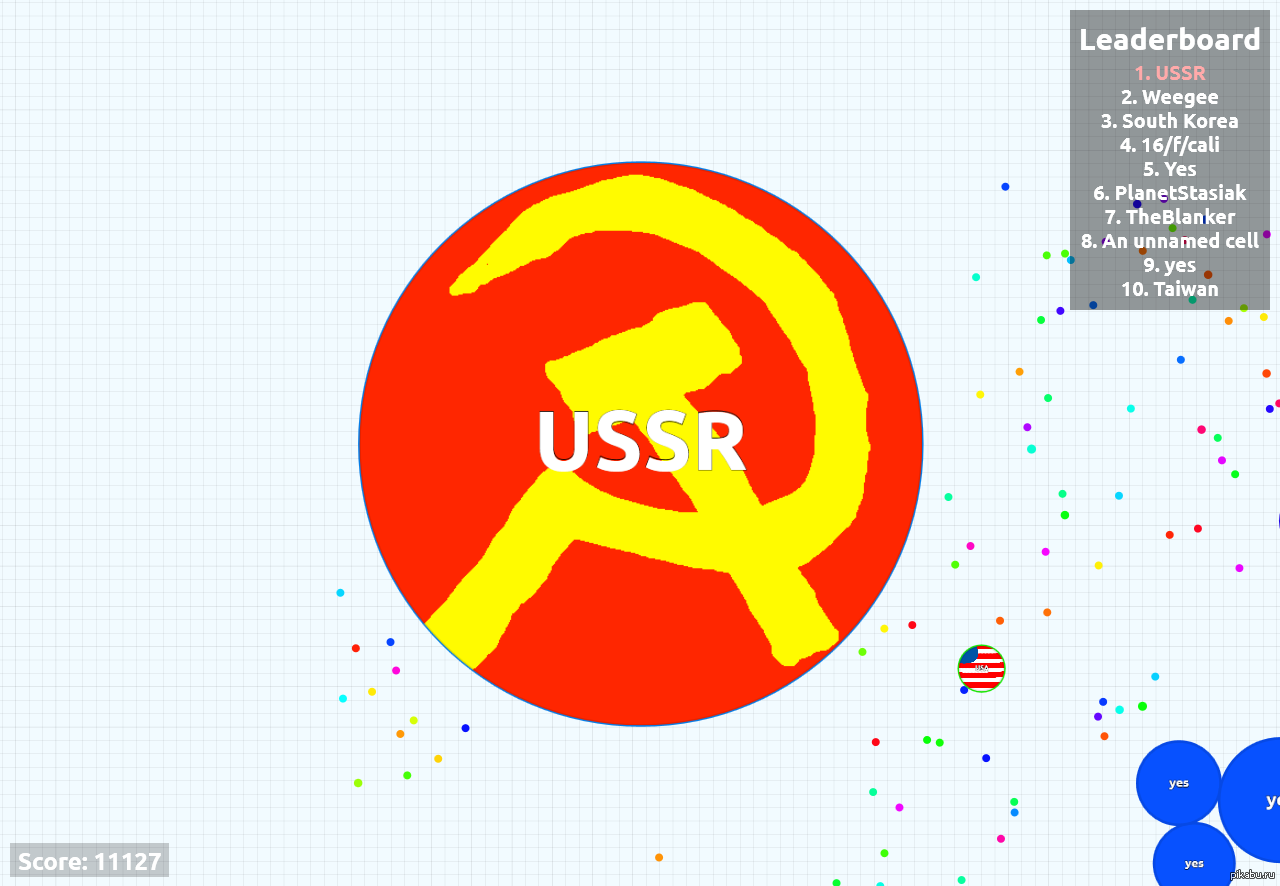 Ar4ik Общими усилиями топ-1 на американском сервере 10 лет назад В меня влетали кучи шариков "USSR". В итоге звёздно-полосатый шарик был поглощён [моё] Agario СССР Гордость Топ