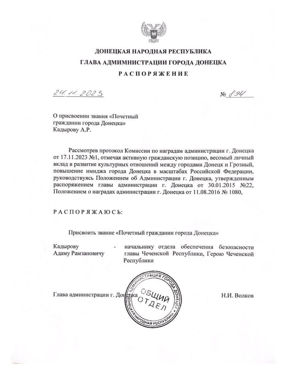 Адаму Кадырову присвоили звание «почётный гражданин Донецка».