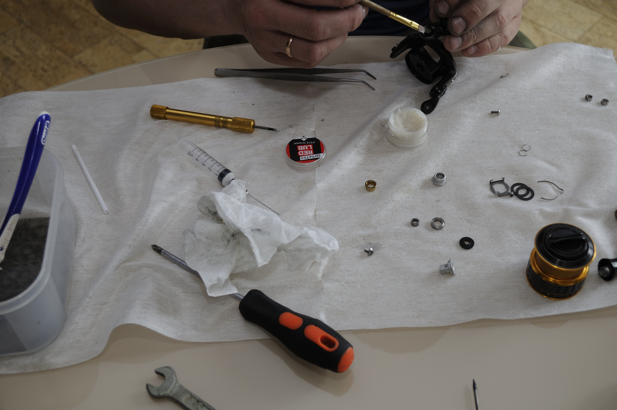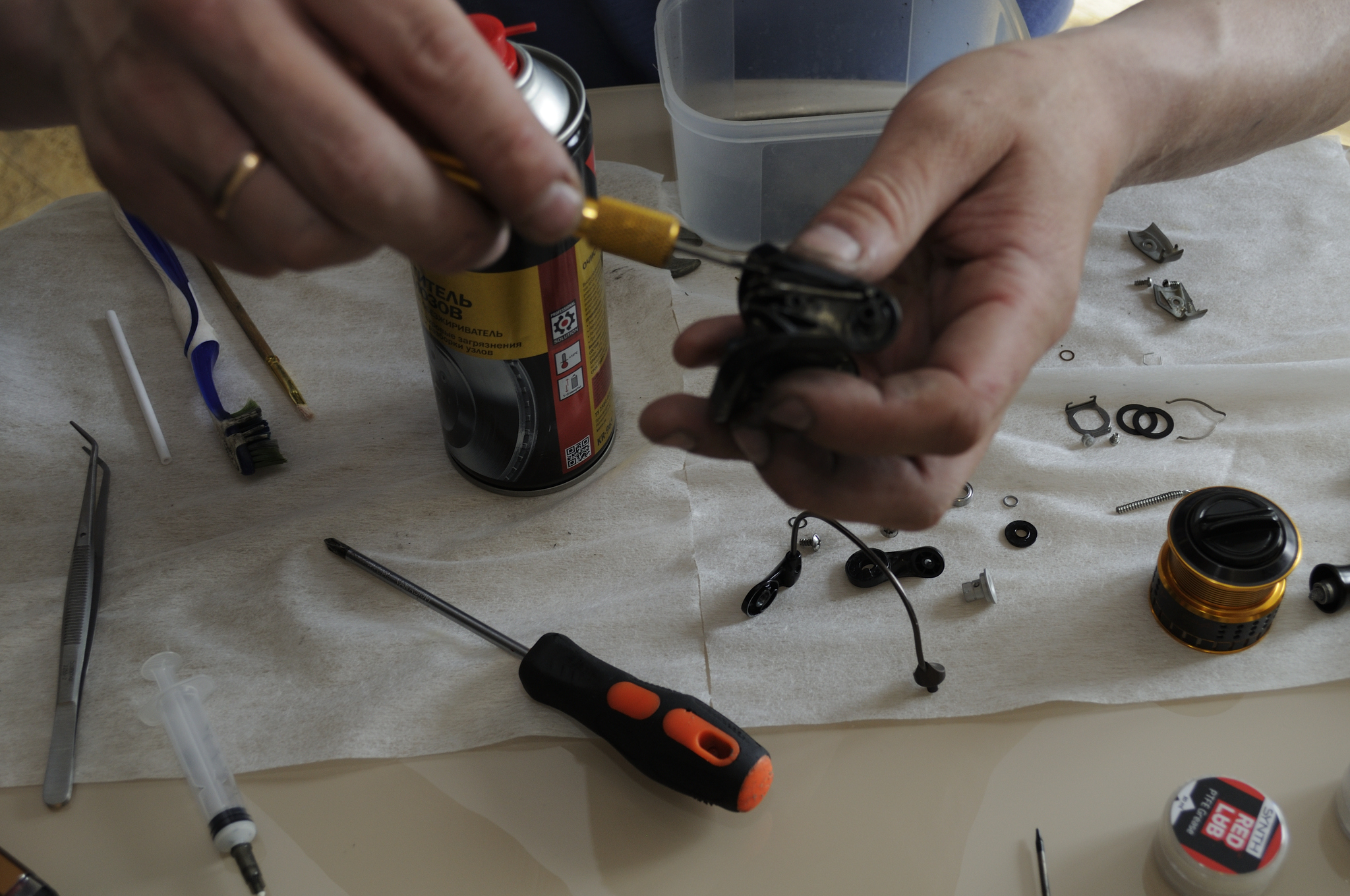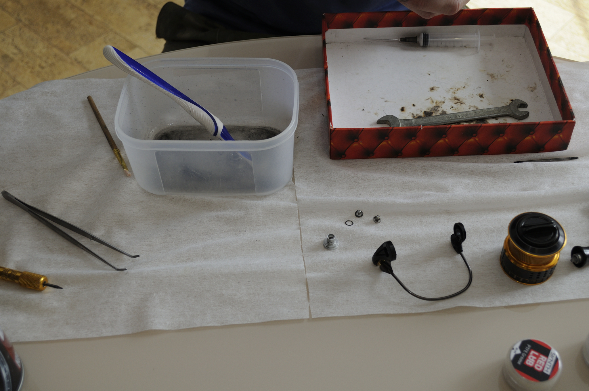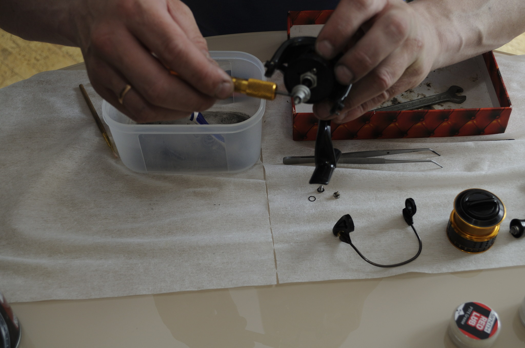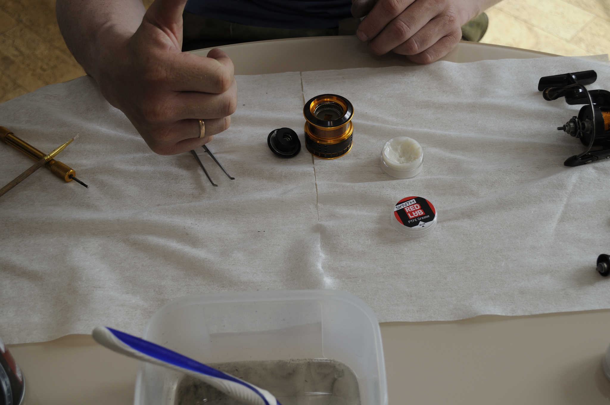 Откручиваем крепежные винты крышек ротора. Это, пожалуй, самое грязное место в катушке - там и песок и смазка и кусочки водорослей. Тщательно промываем, откладываем в сторону и переходим к смазке подшипников.
