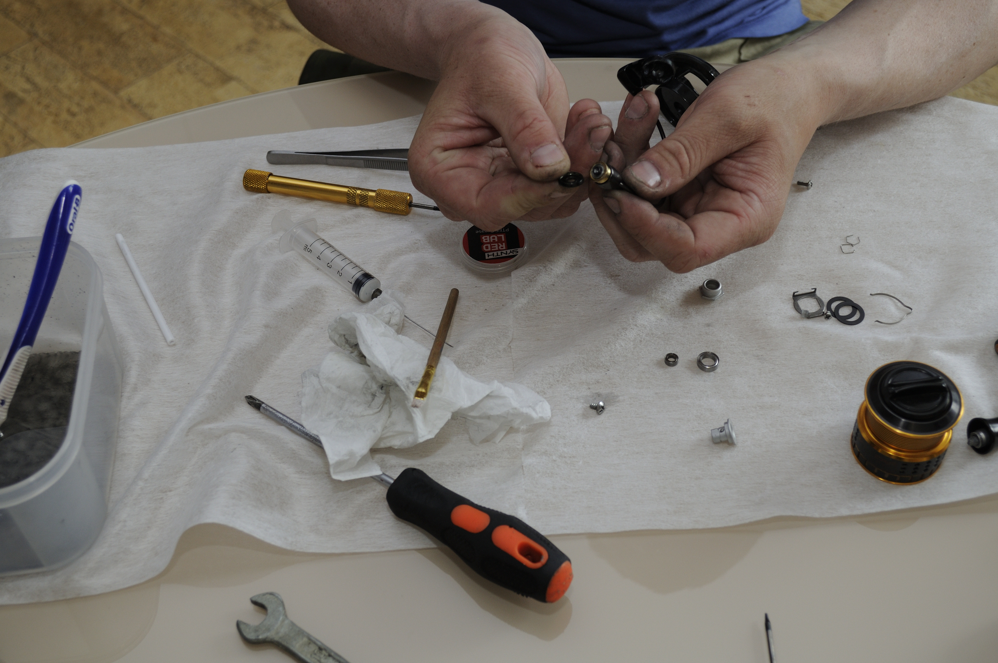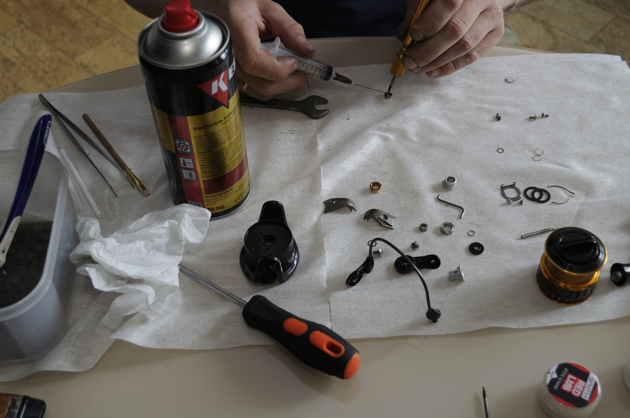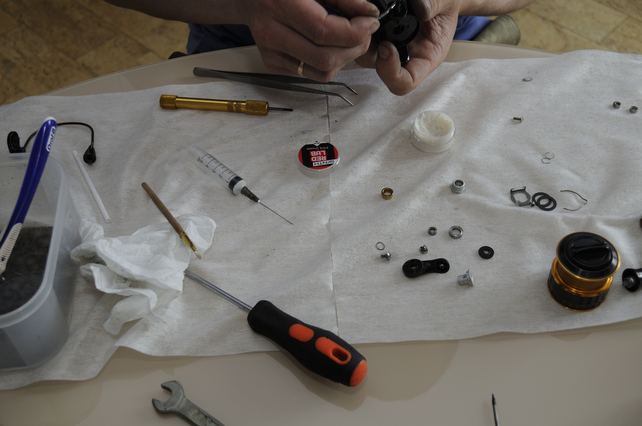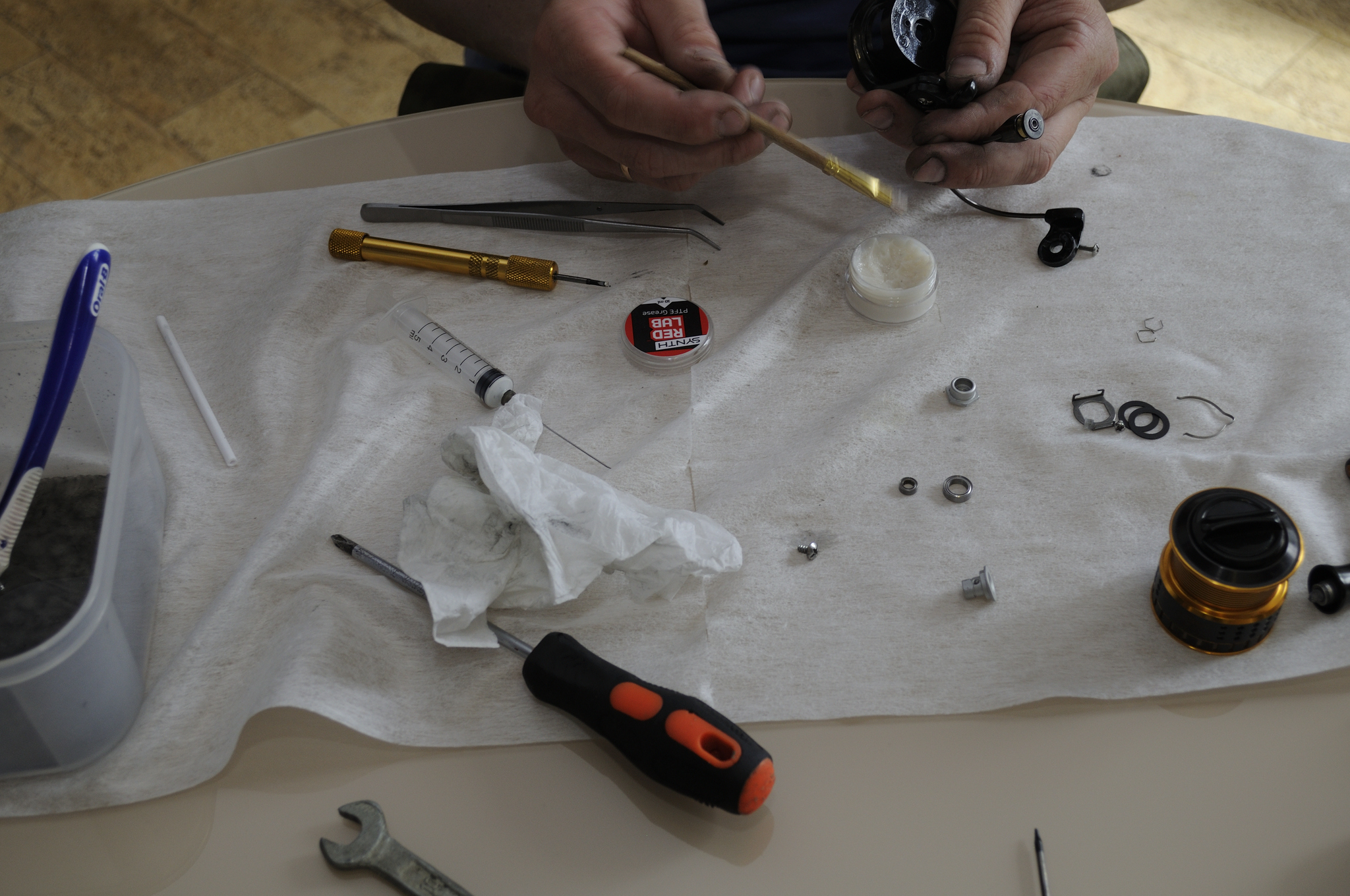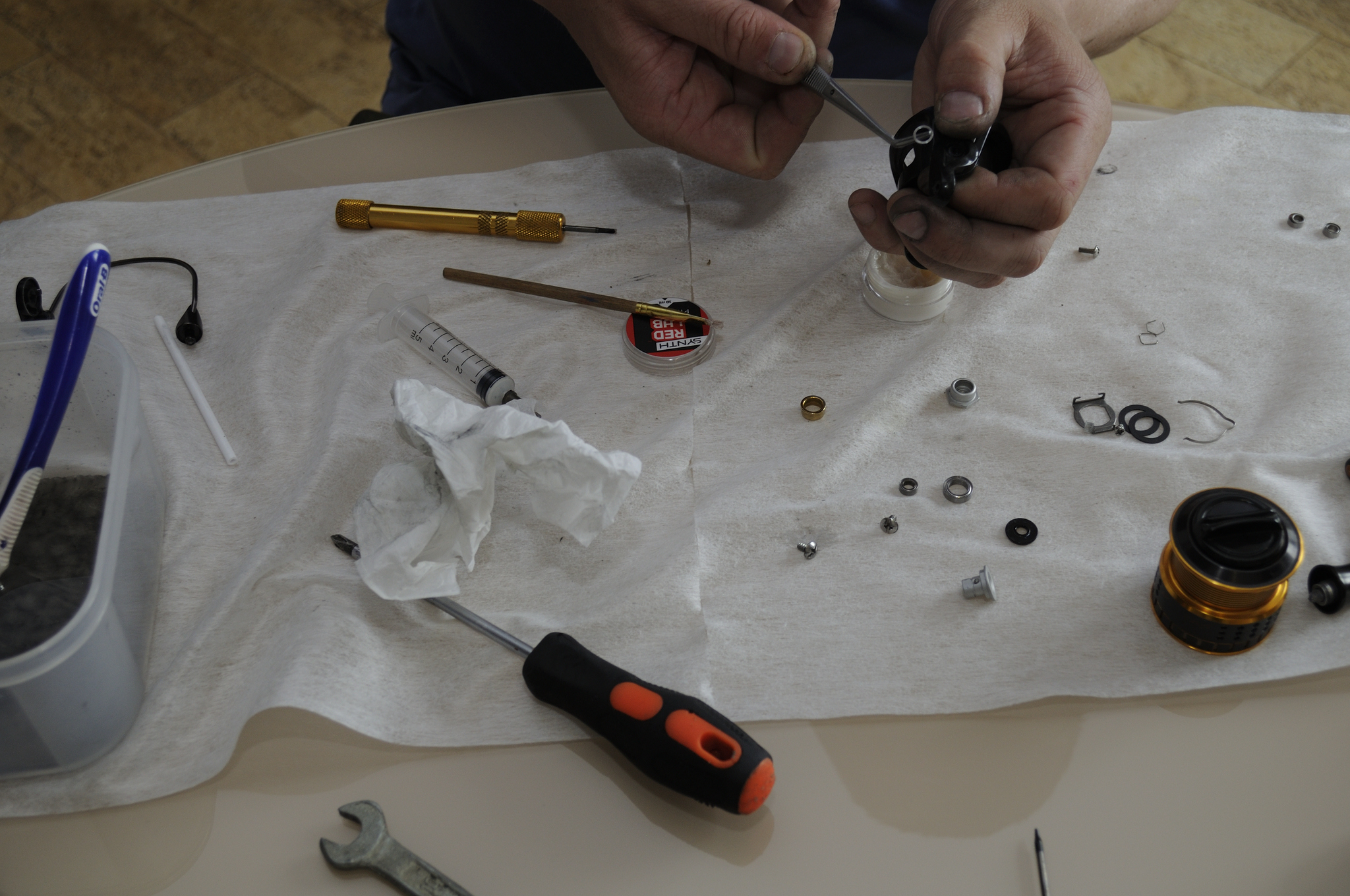 Откручиваем крепежные винты крышек ротора. Это, пожалуй, самое грязное место в катушке - там и песок и смазка и кусочки водорослей. Тщательно промываем, откладываем в сторону и переходим к смазке подшипников.