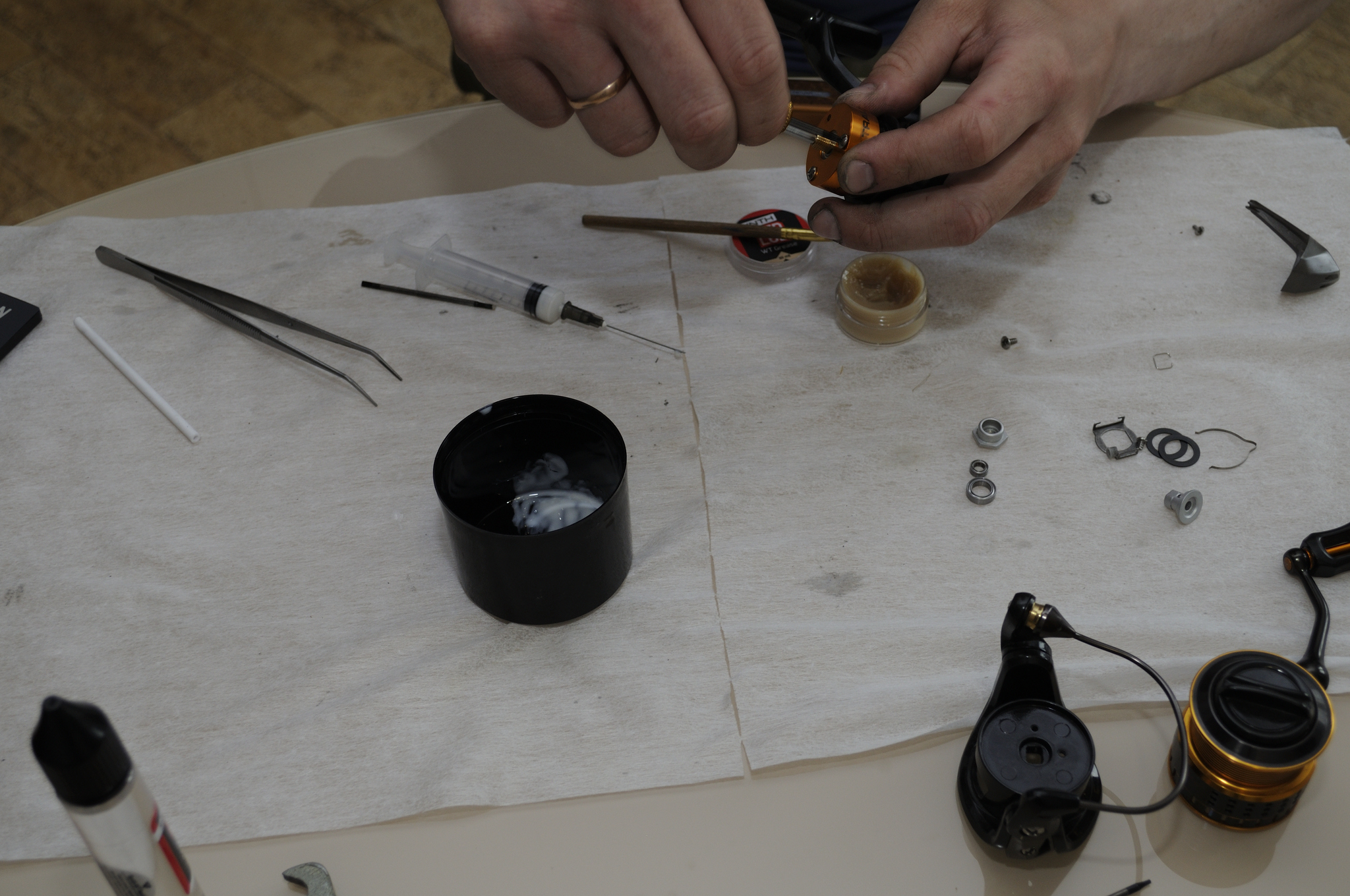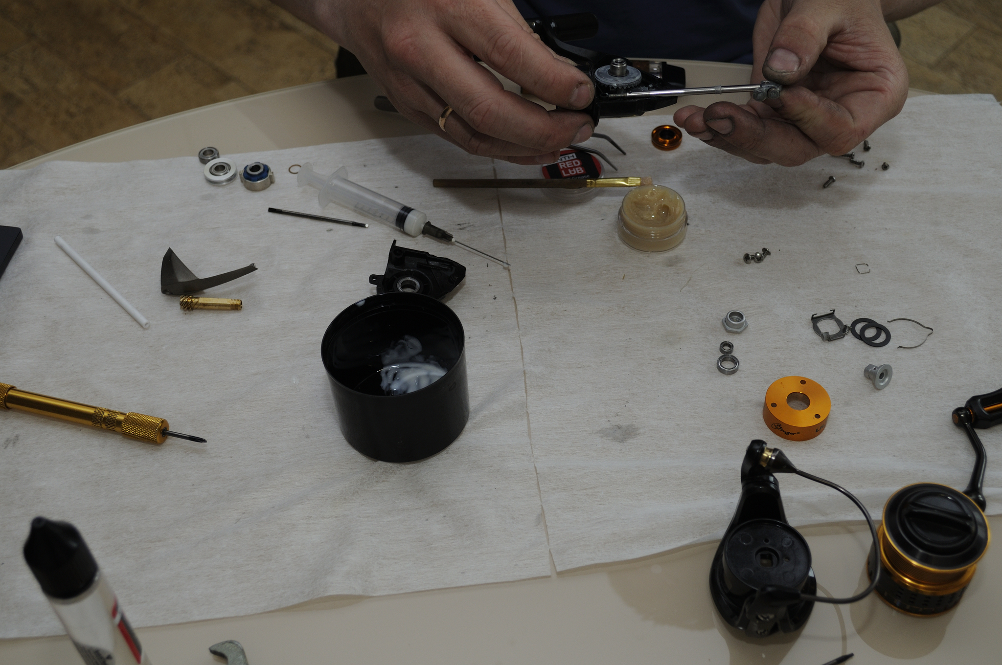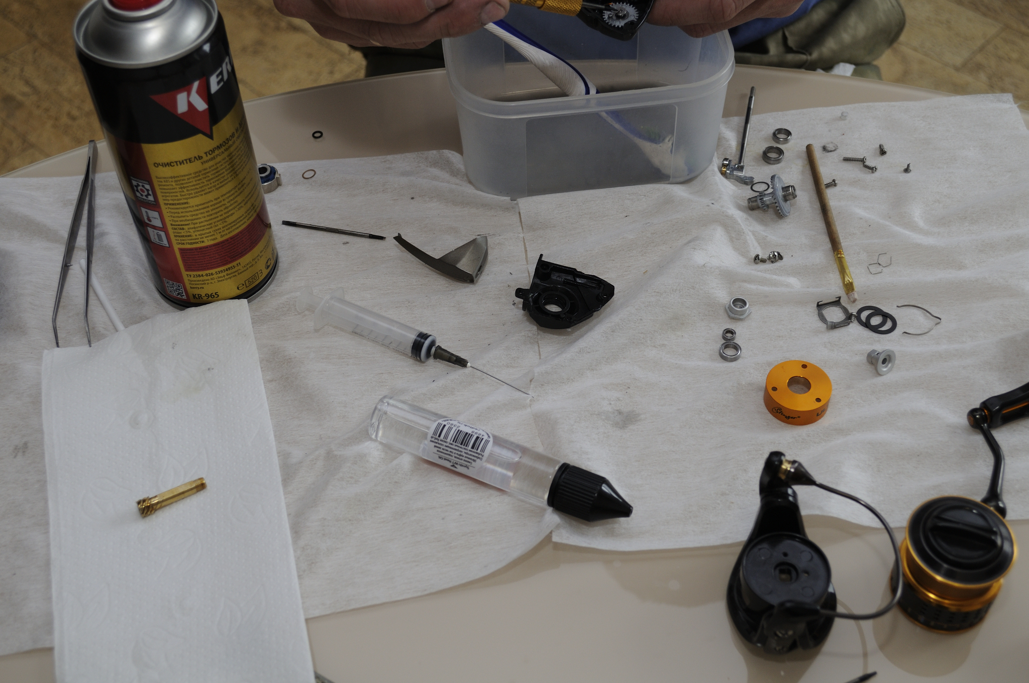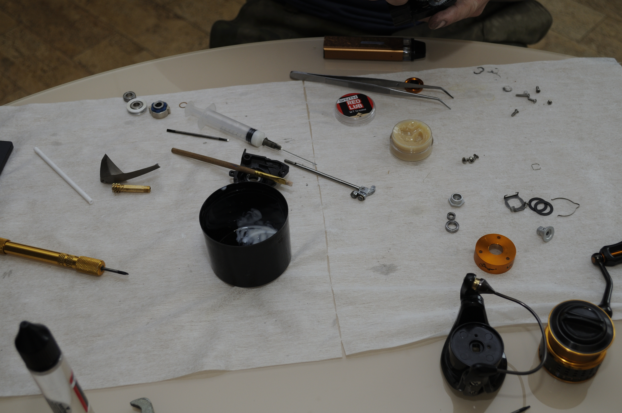 Наносим WT Grease на направляющие оси шпули и на внешнюю часть подшипников на ней. Одеваем пластиковую втулку шляпкой внутрь.