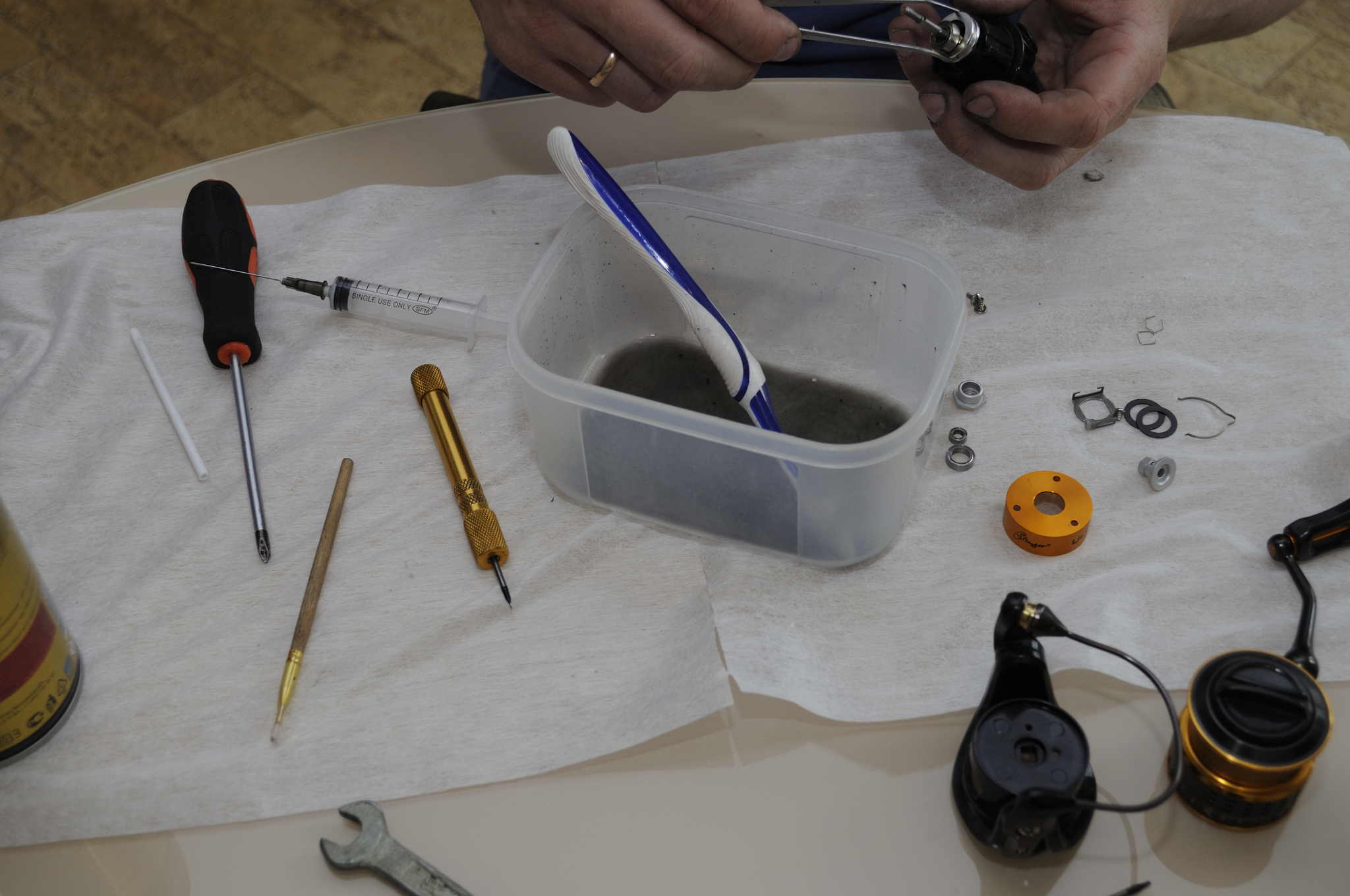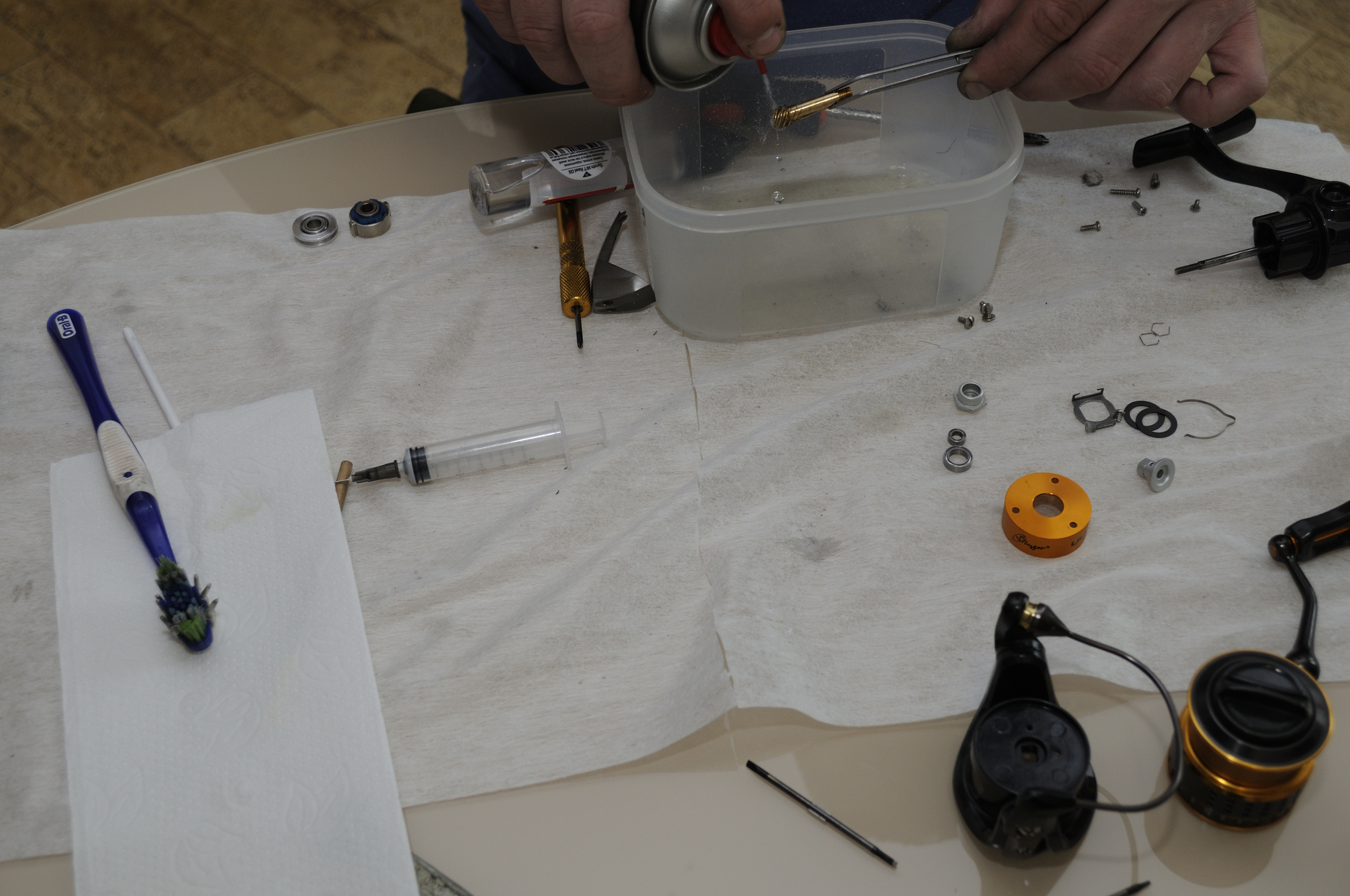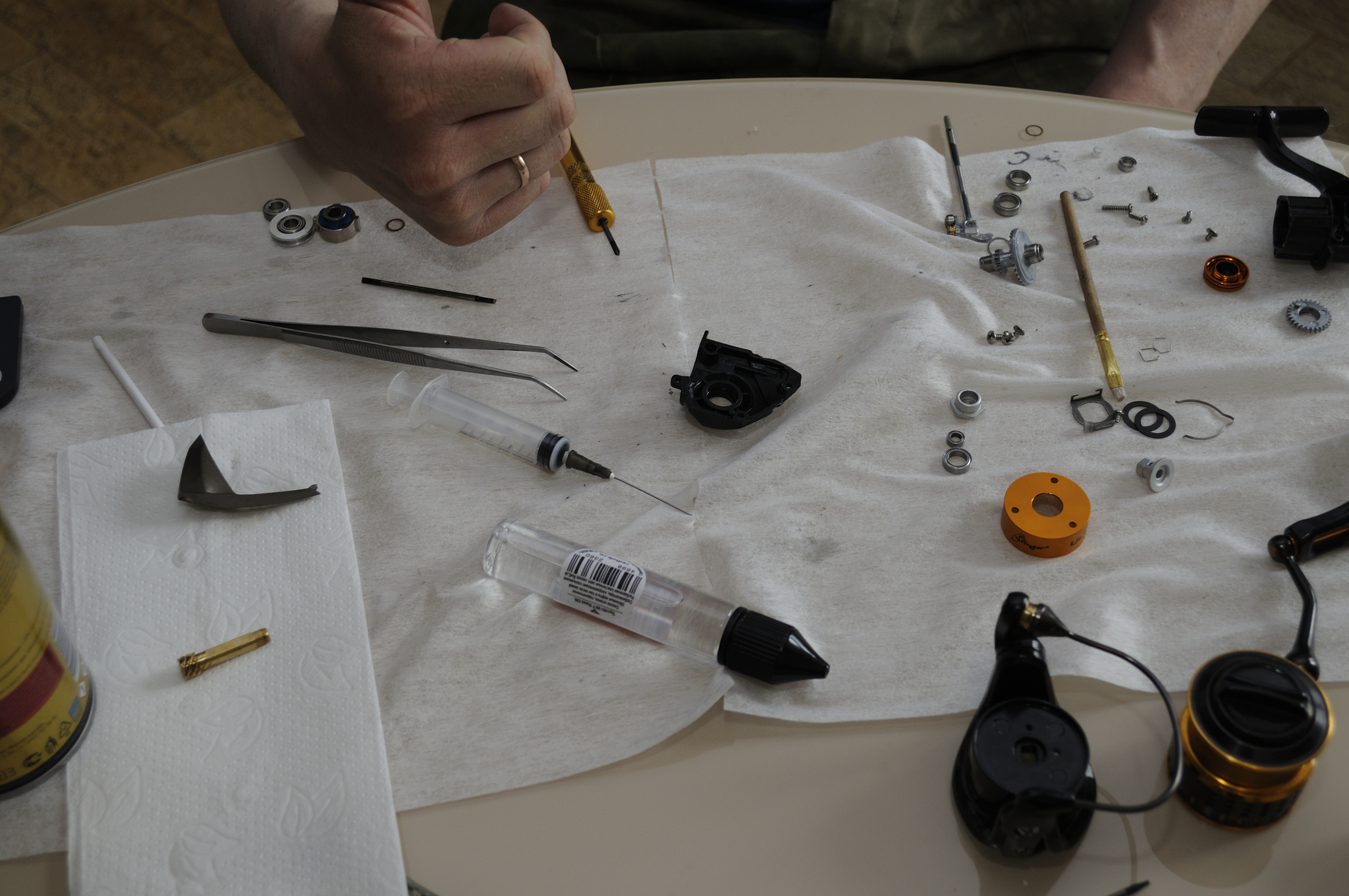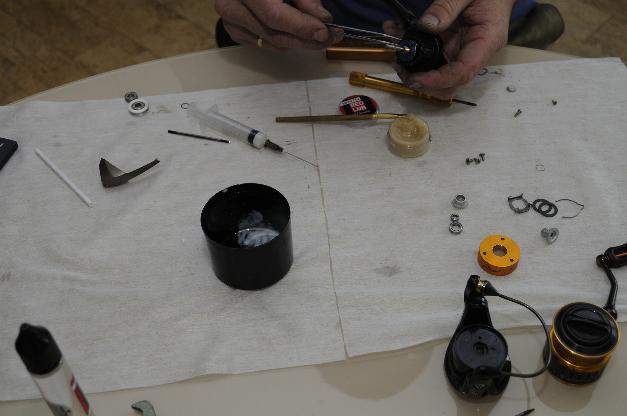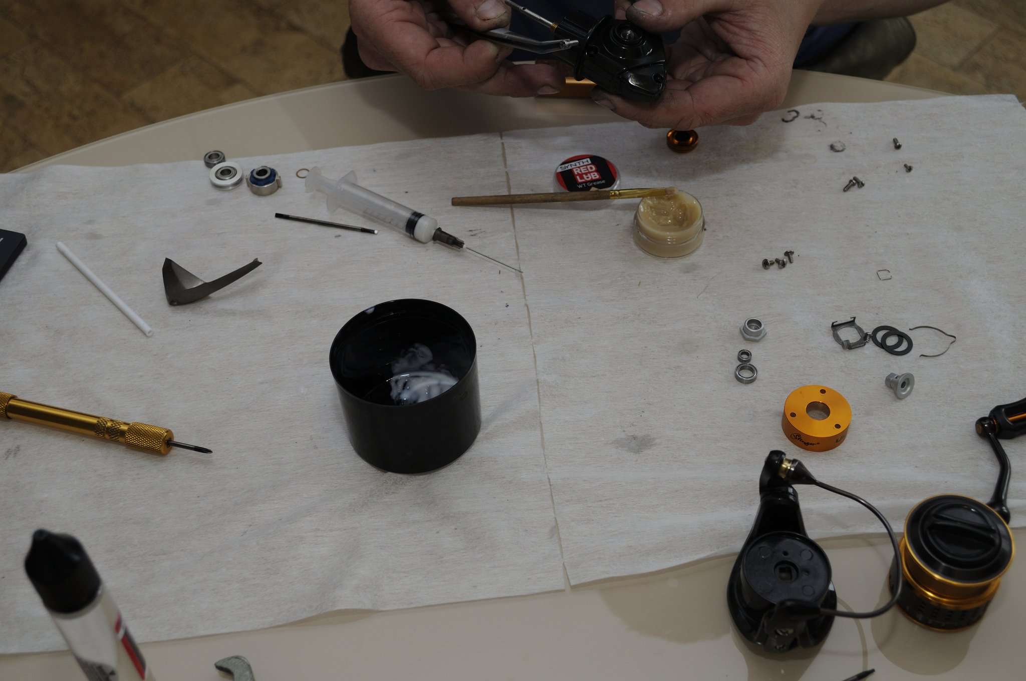 Наносим WT Grease на направляющие оси шпули и на внешнюю часть подшипников на ней. Одеваем пластиковую втулку шляпкой внутрь.
