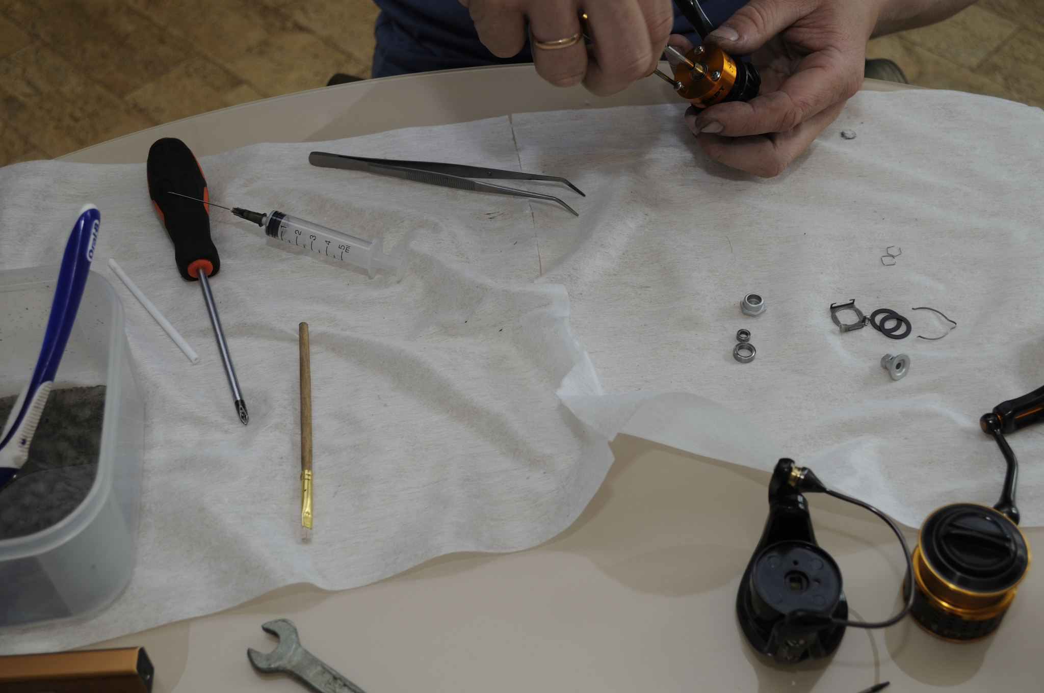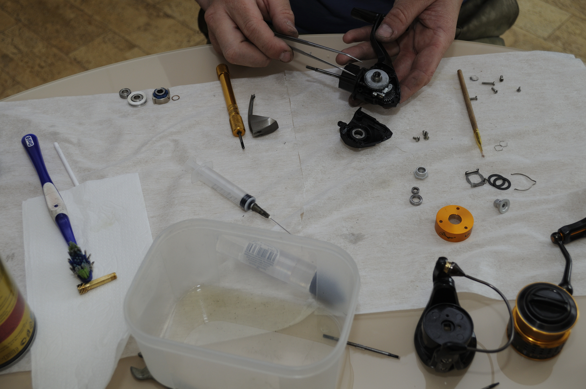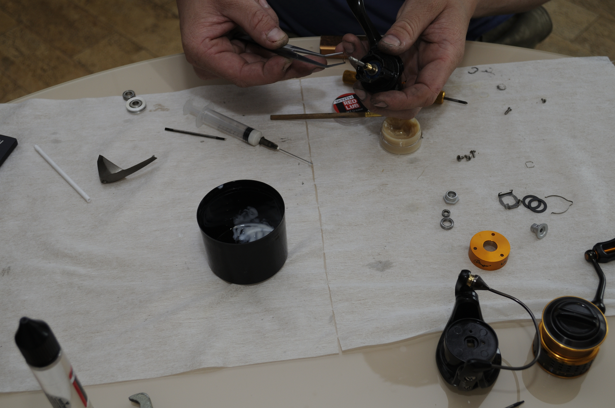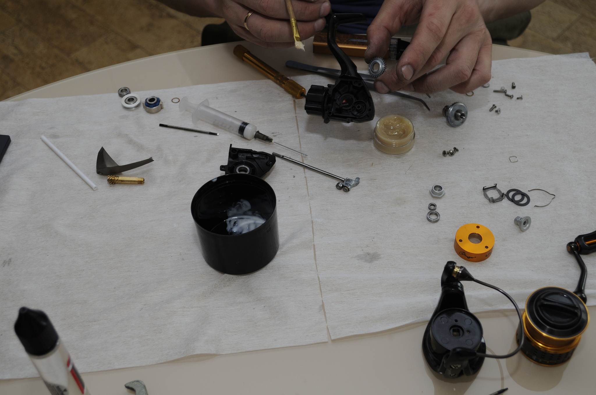 Собираем корпус. Устанавливаем обгонную муфту. Обгонную муфту и ось шпули смазываем WT Reel Oil. До установки ротора катушка будет рычать и клинить, не нужно её мучать и крутить. После установки ротора механизм сбалансируется, ход будет плавным.
