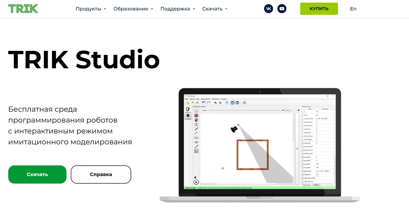 Еще есть TRIK Studio — среда программирования, позволяющая решать задачи как с помощью последовательности картинок, так и сложного текстового языка. Бесплатная среда программирования роботов с интерактивным режимом имитационного моделирования.