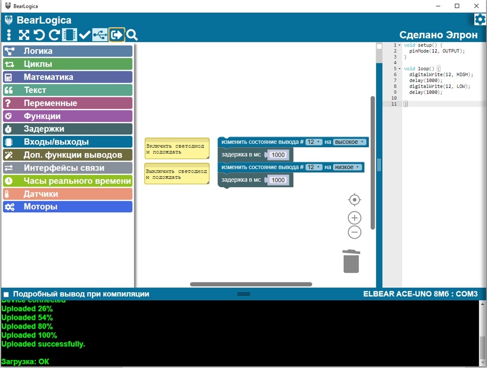 BearLogica — это интуитивно понятная русскоязычная визуальная среда программирования, разработанная компанией Элрон, как часть экосистемы для работы с отечественными микроконтроллерами. Приложение предназначено для программирования микроконтроллерных плат ELBEAR, разработанных в Элрон на базе российского чипа MIK32 Амур, выпускаемого компанией «Микрон».