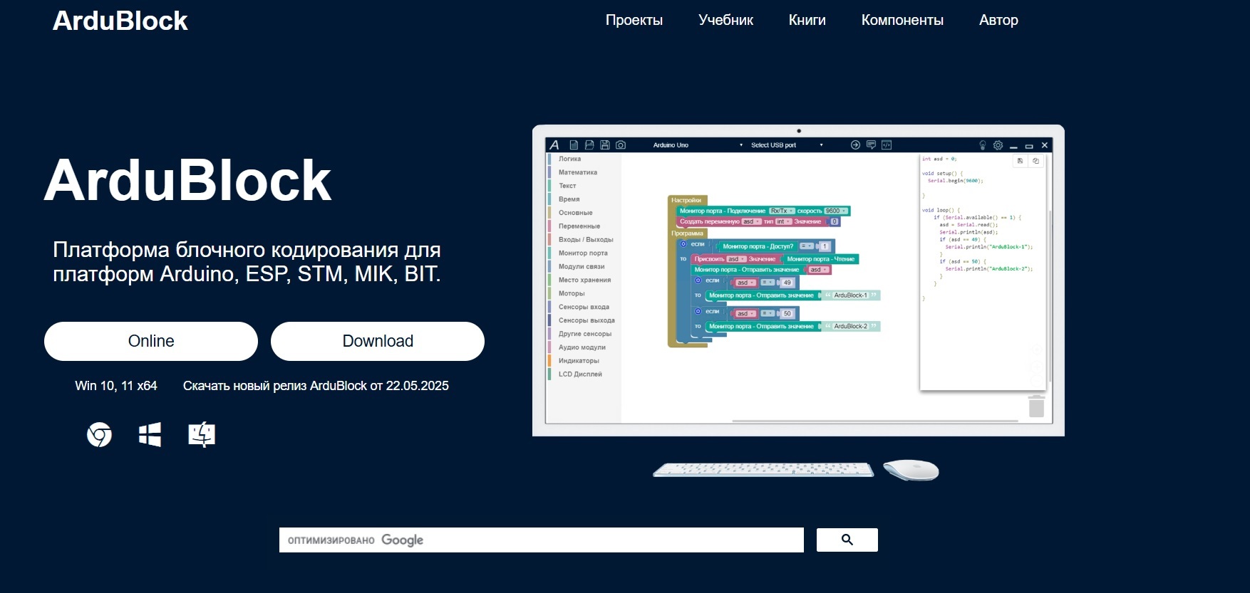 Ardublock: это платформа блочного кодирования для платформ Arduino, ESP, STM, MIK, BIT, доступна поддержка плат ELBEAR