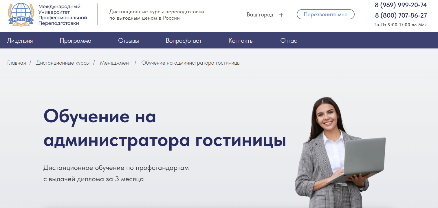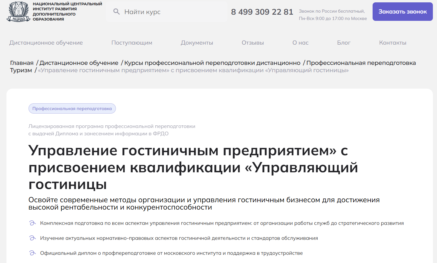 Готовит профильные кадры. Обучение проходит дистанционно, не требует отрыва от работы. Программа составлена по профессиональным стандартам. Дает четкое понимание обязанностей администратора. Слушатели изучают обслуживание гостей, бронирование, управление персоналом. Изучается методы документооборота. Теория сразу подкрепляется практическими примерами из реальных гостиниц. Материал изложен просто и доступно, что помогает быстро освоить профессию. По окончании выпускники получают диплом, подтверждающий квалификацию. Курс помогает начать карьеру в гостиничном бизнесе и повысить профессиональный уровень сотрудников.