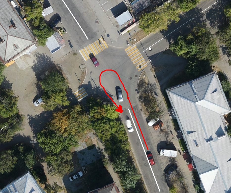 Следом сажусь я, обстановка в машине гнетущая, по взгляду инспектора я не сдал уже, как только открыл дверь машины. Тронулся, поехал, впереди светофор, притормозил, но чувствую, что мне в торможении "помогают", не придал значения. Мой зелёный, я стоя на тормозе, спускаю сцепление и как только мой загорается плавно трогаюсь, но я выжимаю сцепление, отпускаю чуток, а машина стоит, думал может передачу не доткнул, нет всё в норме. Сзади стали сигналить, я чувствую как в ногу ударило сцепление я нажимал в это время газ и тут машина с рывком через перекрёсток. Тут уж к бабке ходить не надо, что инспектор нажала на сцепление. Дальше горка, и на ближайшем перекрёстке развернитесь. Я по главной, помеха справа, т.к. главная уходит вправо. Пропустил машину и стал разворачиваться (см.скриншот)