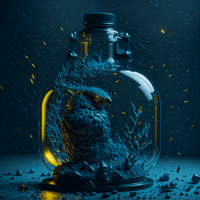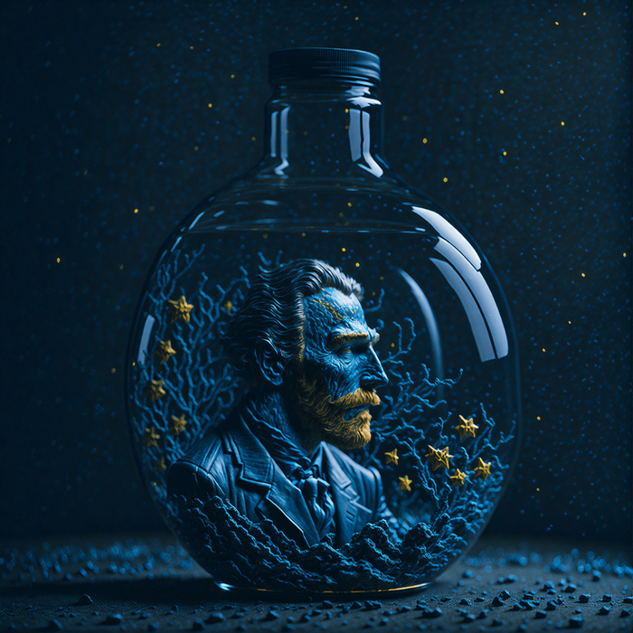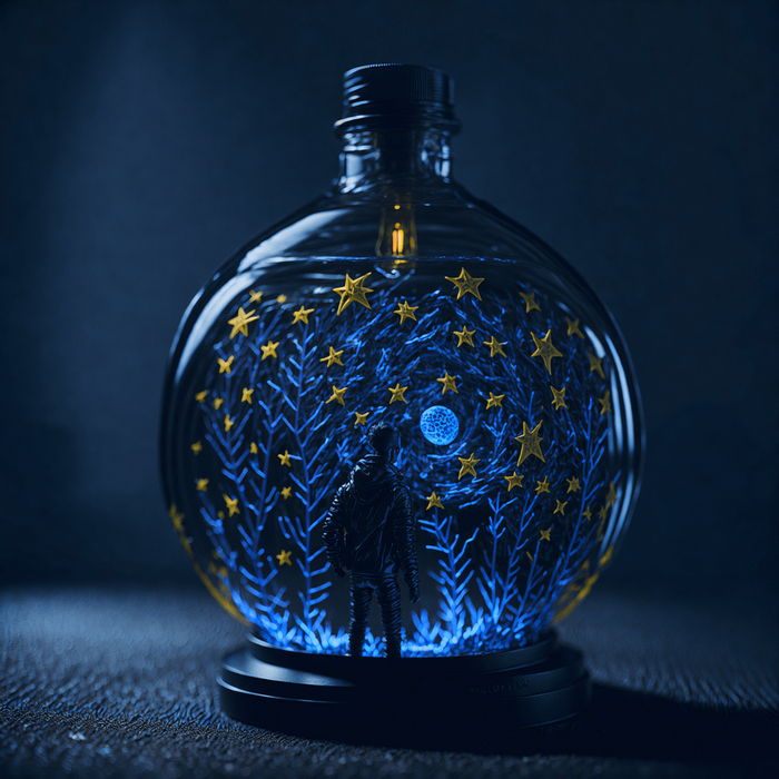 (van gogh starry night:1.2) in a big glass round bottle, dark room, glowing