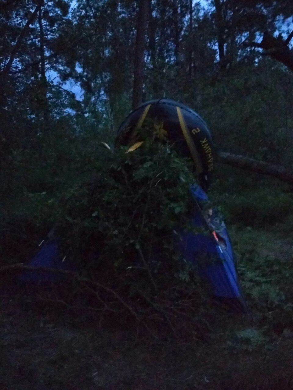 Первым делом спрятал мою избранницу в палатку. Далее мозг переключился на режим выживания, и я принялся бегать по острову в поисках веток. Начало накрапывать. У меня были минуты, чтобы спасти ситуацию. Я инстинктивно накрыл лодкой половину палатки, вторую половину начал забрасывать ветками и листьями папоротника, которыми была усыпана вся округа.