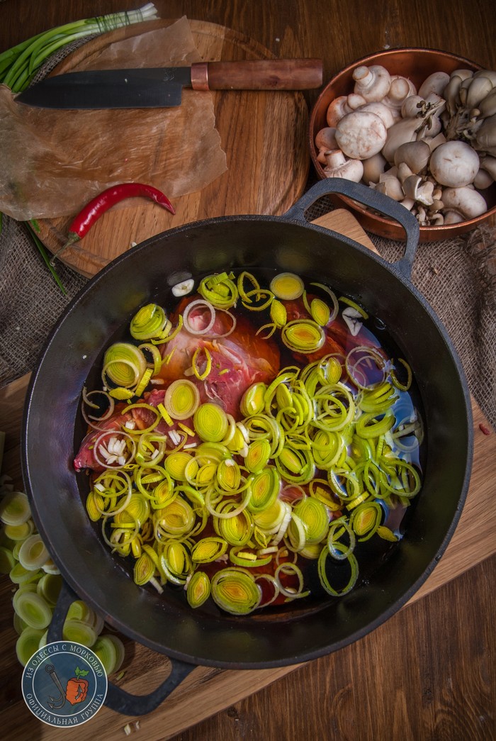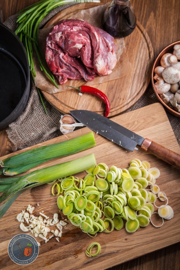 - В казан или тяжелую кастрюлю поместить мясо, нарезанный тонкими кольцами лук-порей,(немного лука порея оставить про запас) порубленный чеснок. Влить соевый соус и воду. Приправить солью и перцем.