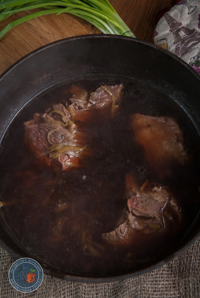 Мясо может быть разным: лента свиных ребер, диетические кролик или привычная курица (которая даст вкусный бульон, но будет проигрывать по мясу). Мне в таком блюде нравится именно разваренная говядина или баранина. Причем мясо выбирайте не постное. Немного жира и кости приветствуются.