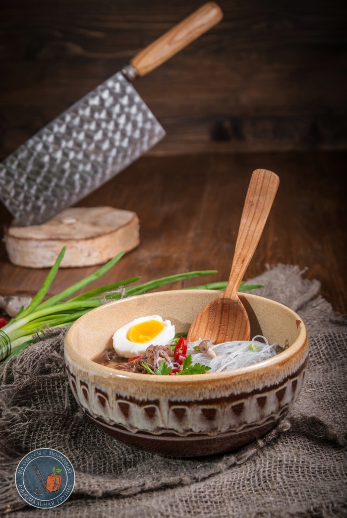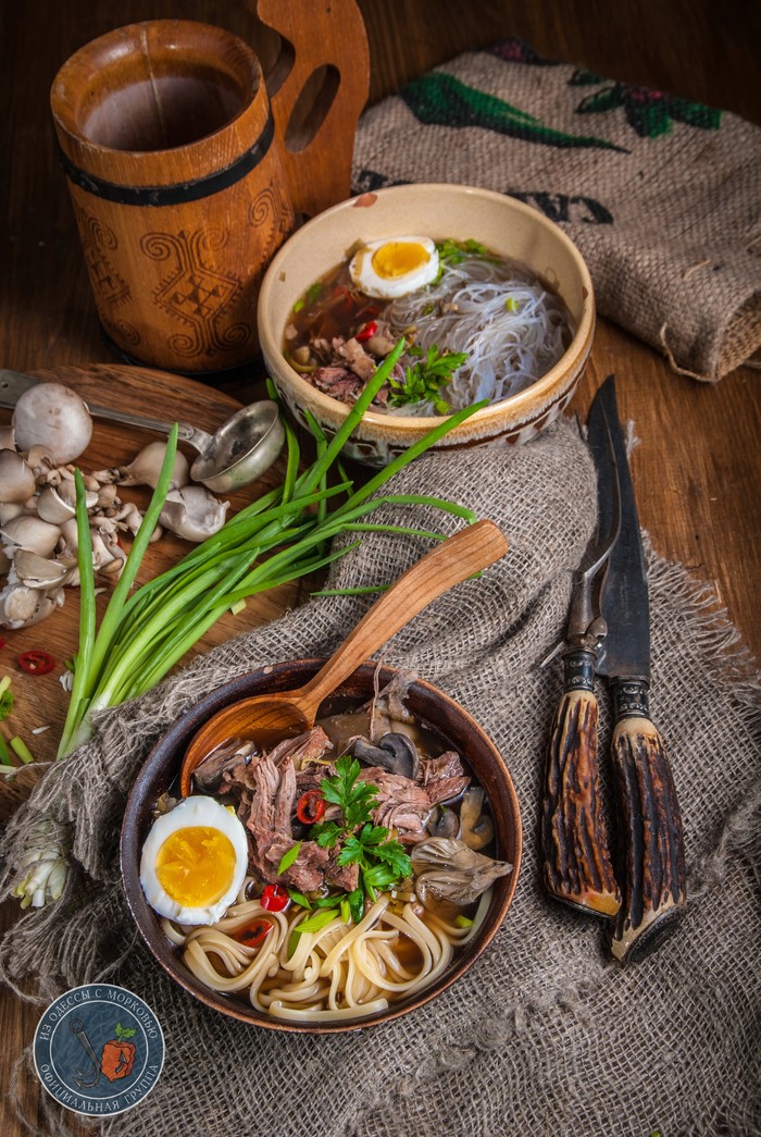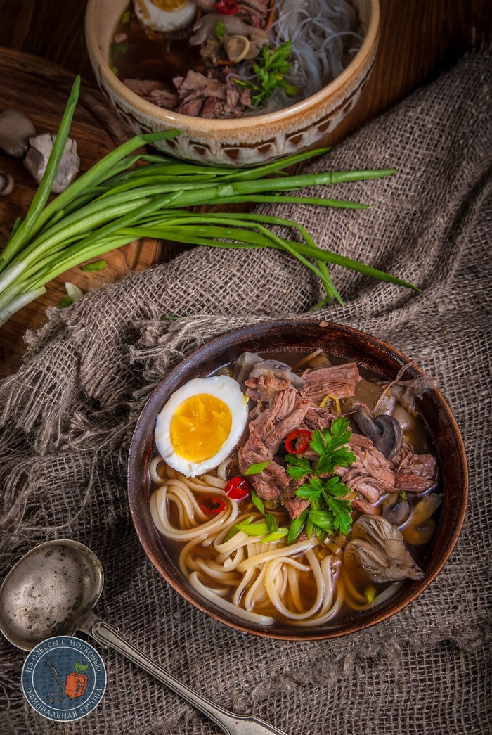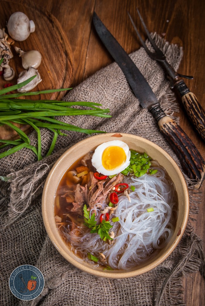 - Теперь осталось лишь собрать все вместе: В глубокую тарелку выложить спагетти-феттучине(или что там у вас будет) (фунчозу), залить горячим бульоном с мясом и грибами, сверху поместить половинку яйца, присыпать зеленым луком и по желанию острым перцем и приготовить большую ложку.