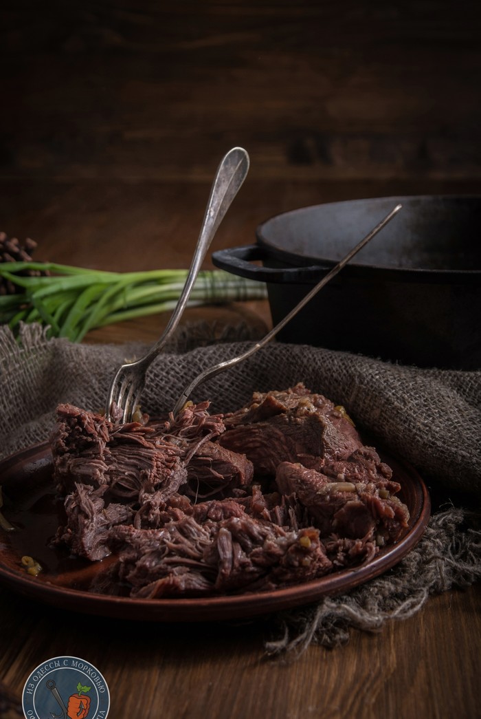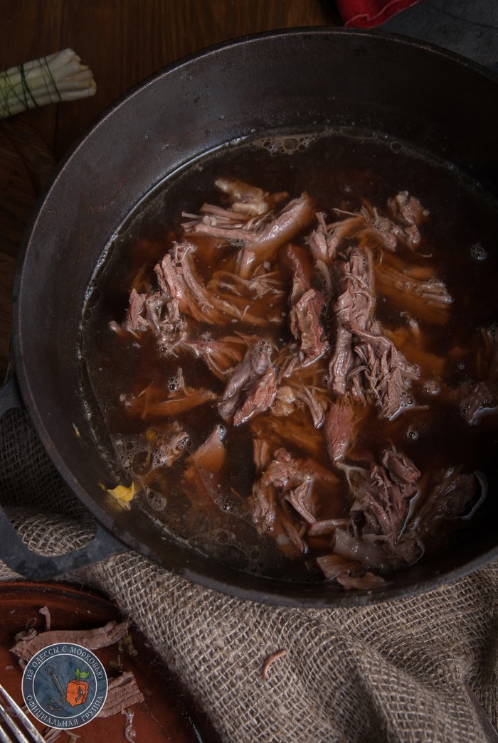 - Достать мясо и с помощью двух вилок разорвать его на волокна. Вернуть мясо в бульон.