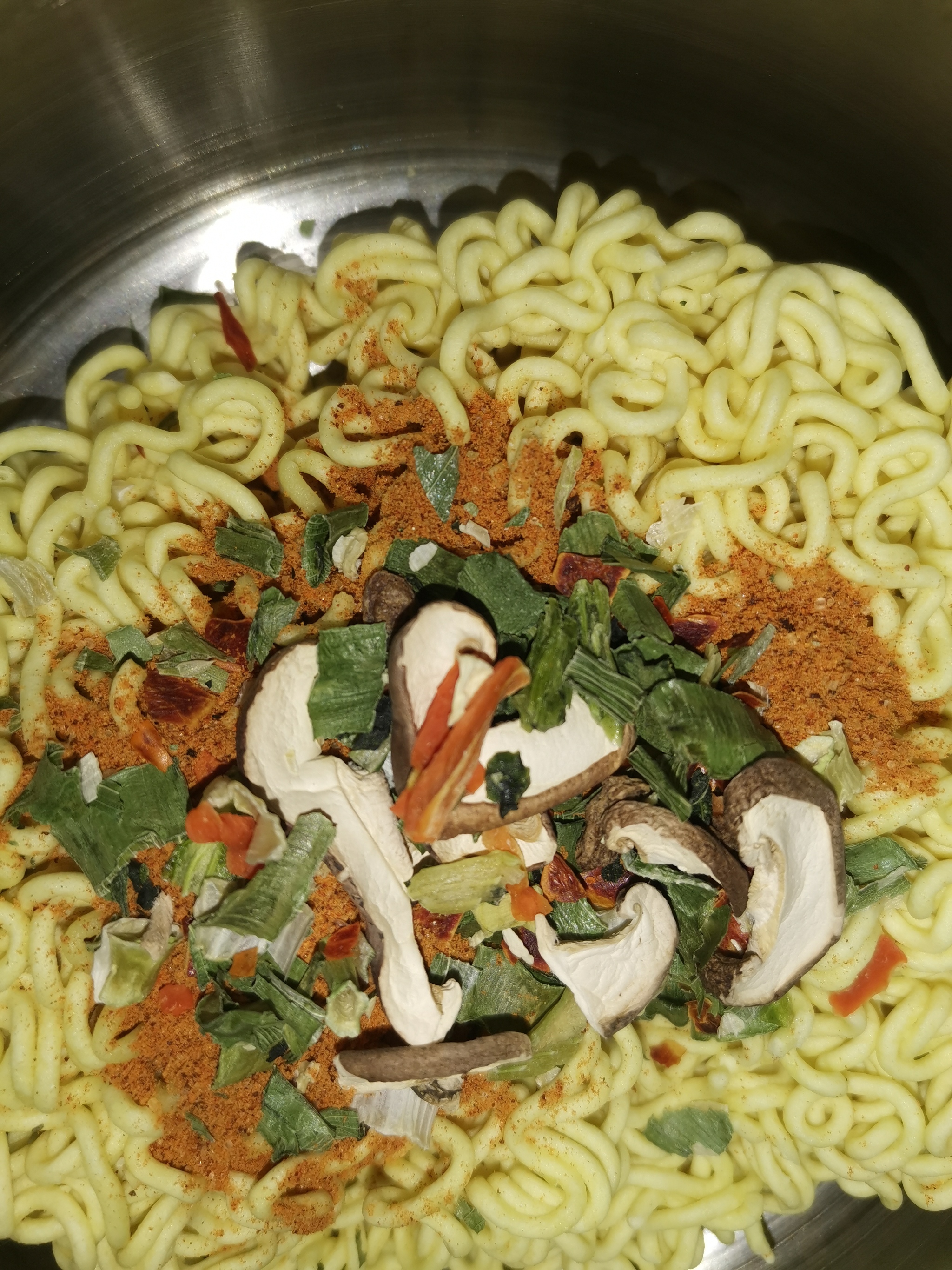 Моё уважение производителю за круглую форму, квадратных кастрюлек в доме нет, а такой кругляш удобно погружать в миску)). Традиционно, 2 пакетика, один с бульонной основой, второй-с сушкой(хотелось бы больше).