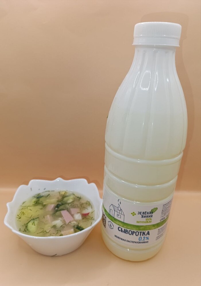 Очень лёгкий напиток, еле слышна молочная составляющая, минимальная кислинка, но зато сыворотка не перетягивает одеяло на себя и вы можете насладиться салатом, который обычно теряется при других жидкостях. Интересно, имеет место быть. А еще из оставшейся сыворотки вышли великолепные блины.