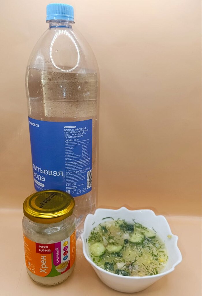 Про такой вид окрошки много лет назад рассказал мне мой бывший молодой человек, я даже какое-то время с удовольствием ела такую вариацию. Всё просто - нужна газированная вода и хрен для яркости вкуса, но в этот раз что-то пошло не так, то ли вода была недостаточно газированной, то ли окрошка на рассоле захватила мой разум, но эта комбинация мне уже не казалось такой вкусной как раньше. Однозначно нужно будет перепробовать!