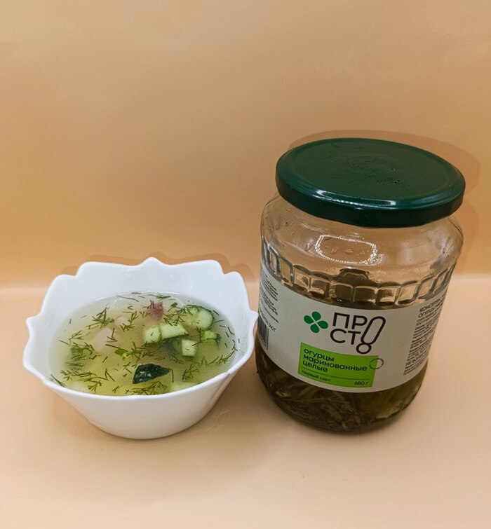 Про такой рецепт до этого и не слышала, смешиваем рассол и кипяченную (холодную) воду 1:2 и заливаем салат, у меня на это ушло 50 грамм рассола и 100 грамм воды. И это сегодня мой фаворит (квас не в счёт), если подобрать правильный рассол, который вам нравится, то можно съесть не одну порцию такой окрошки. Рассол даёт все необходимые вкусы, соль, перец, кислинку, сладость, чеснок, а вода уменьшает его концентрацию. Приятное открытие для меня сегодня.