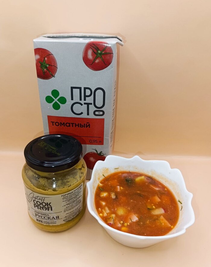 Ну это уже просто сон при температура 40 градусов. Томатный сок, немного горчицы, вуа-ля, вы испортили и сок и салат. Есть это тяжело из-за несочетаемости ингредиентов, ненужной густоты и разновкусия. Это далеко не гаспачо, а скорее пьяный дядя на застолье опрокинул стакан с соком в салат. При том, этот рецепт придуман не мной, а был найден в интернете среди других вариаций окрошки. Не рекомендую