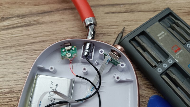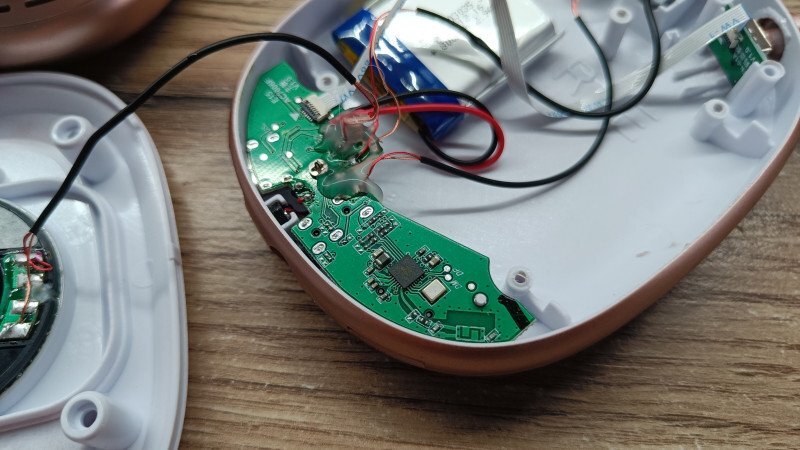 В правой чаше размещается аккумулятор, динамик и несколько плат управления. Все соединения между платами имеют дополнительную фиксацию с помощью термоклея.