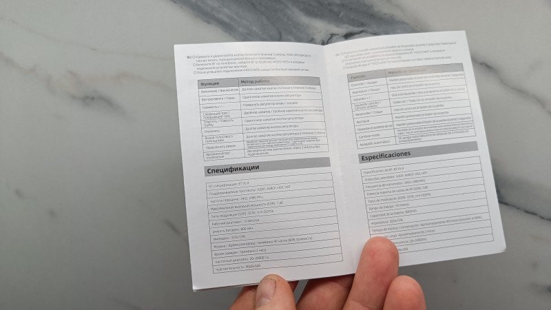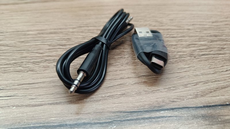 Наушники были заказаны с зона за 850 с небольшим рублей, на данный момент они доступны с картой за 834 руб. За эти деньги мы получаем провод AUX (миниджек 3.5) в резиновой изоляции, что довольно редко встречается у бюджетных гаджетов. Провод питания USB type-c в пластиковой изоляции и длиной около 50 см. Так как поддержки быстрых протоколов нет, то заряжать можно от любого блока питания. Ещё есть мультиязычная бумажная инструкция, в том числе на русском языке. Из полезного там есть небольшое перечисление технических характеристик и управление.