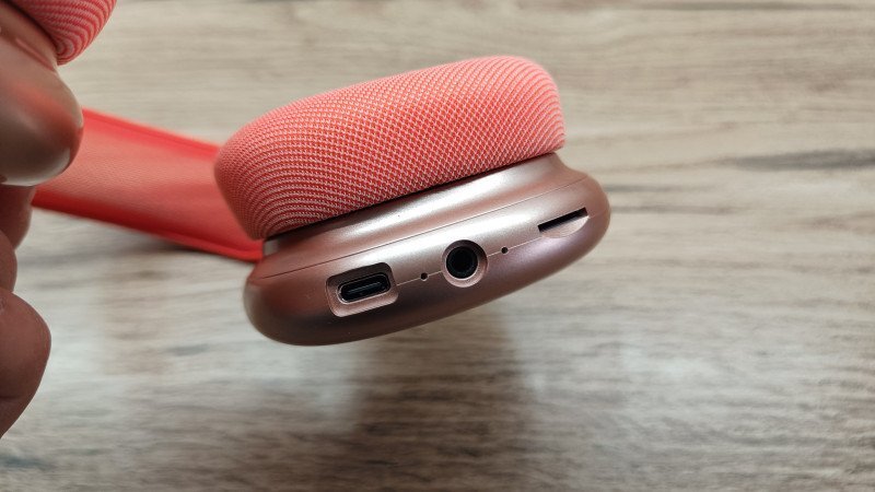 На правой чаше размещаются кнопка включения, функциональная кнопка регулятор, а также разъём карты памяти, разъём подключения миниджек 3.5 и разъём USB type-c. Также есть встроенный микрофон. Левая чаша совершенно пустая.