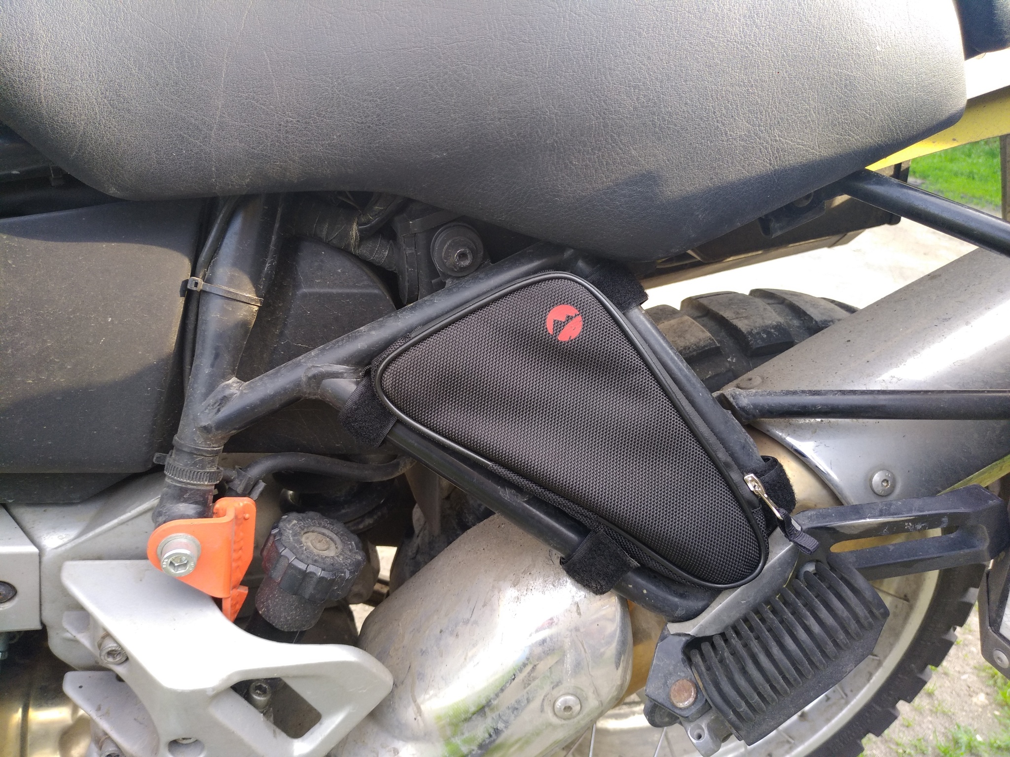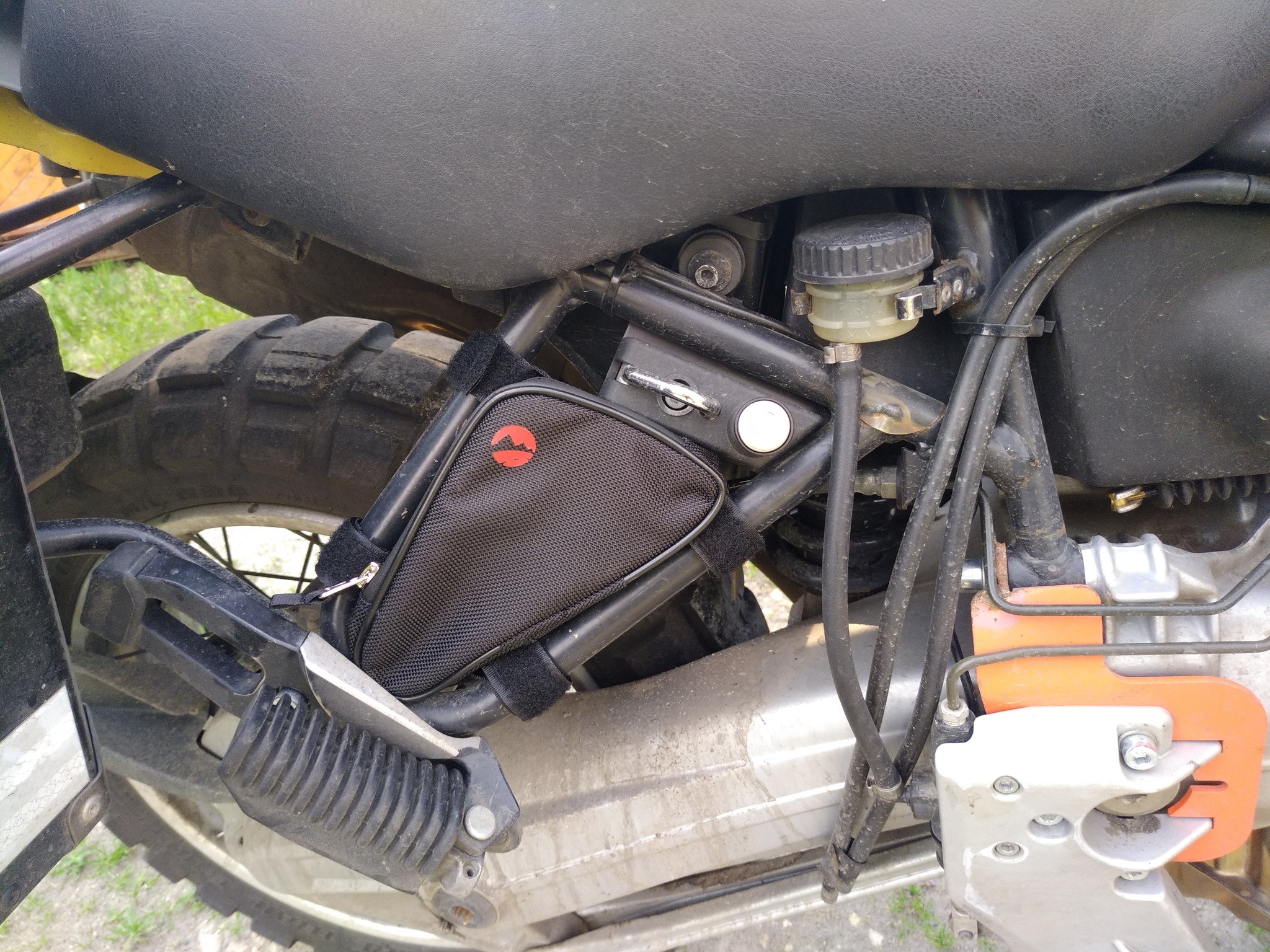Багажная система была полностью пересмотрена. Заводские пластиковые кофры хорошо подходят только для езды по дорогам, на бездорожье они могут оторваться, причём даже не от падения, а от тряски. Поэтому, я заменил их на полноценную багажную систему с тремя кофрами (боковые по 25 л, задний на 55 л) и инструментальным ящиком на 2,7 л. А что, багажного места много не бывает. Добавил шумоизоляции внутрь, чтобы об острые края не страдал багаж, и поставил мягкую спинку для пассажира. Плюс мне досталась оригинальная сумка на бак, но ездил с ней не много, кофров хватало. Дополнительно установил сумки в подножки пассажира от компании kinetic fun. Туда складывал всякую мелочёвку. Кстати, у этой фирмы и другие сумки на этот мот есть, так как автор-создатель раньше владел таким мотоциклом.