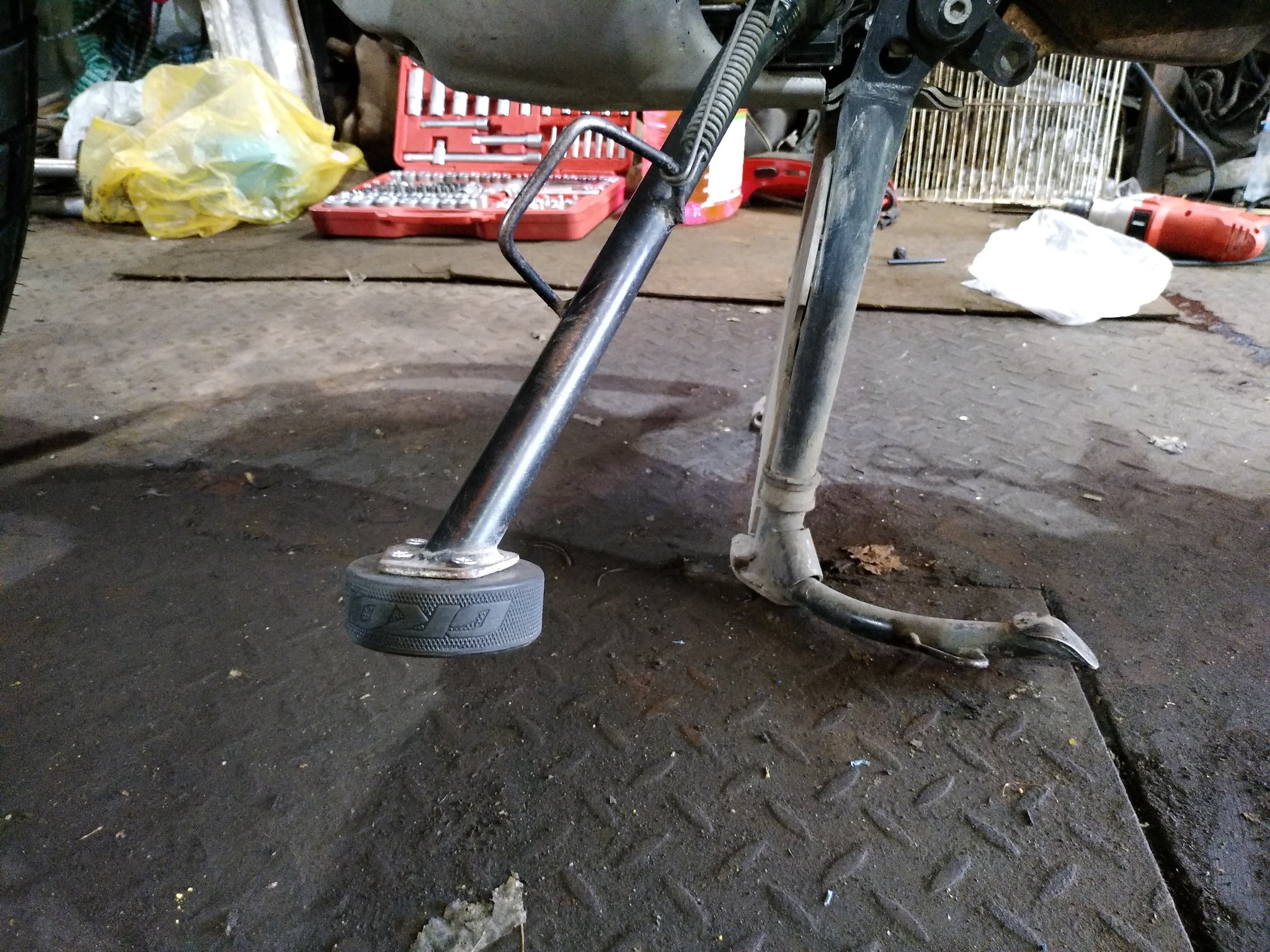 Мотоцикл за счёт большой высоты сильно наклоняется вбок, поэтому установил расширитель/повышатель подножки в виде обычной хоккейной шайбы. После чего проблема ушла.