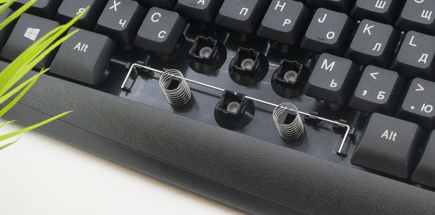Клавиатура Rapoo NK2600 относится к мембранному типу, но и здесь от модели к модели бывают сюрпризы. Здесь они скорее положительные. Корпус получил высокие направляющие для клавиш, как раз из-за конструкции «мембранок» и повышению водостойкости. Под клавишей пробел используются стабилизатор и пара пружин.