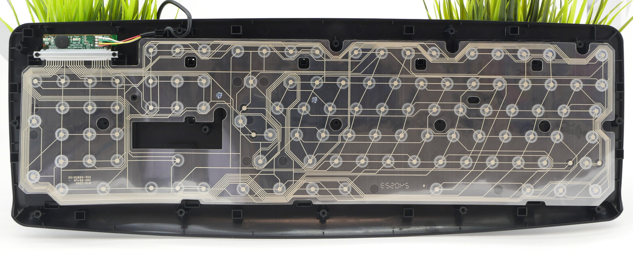 Конструкция Rapoo NK2600 типична другим подобным моделям: по центру располагается мембранная часть с тремя слоями, два из которых наделены проводящими дорожками, и при нажатии замыкается соответствующая линия-цепь. Колпачки приклеены к мембране, поэтому клавиатуру можно легко разобрать и по отдельности почистить детали в будущем.