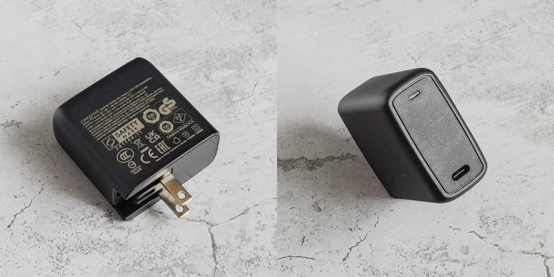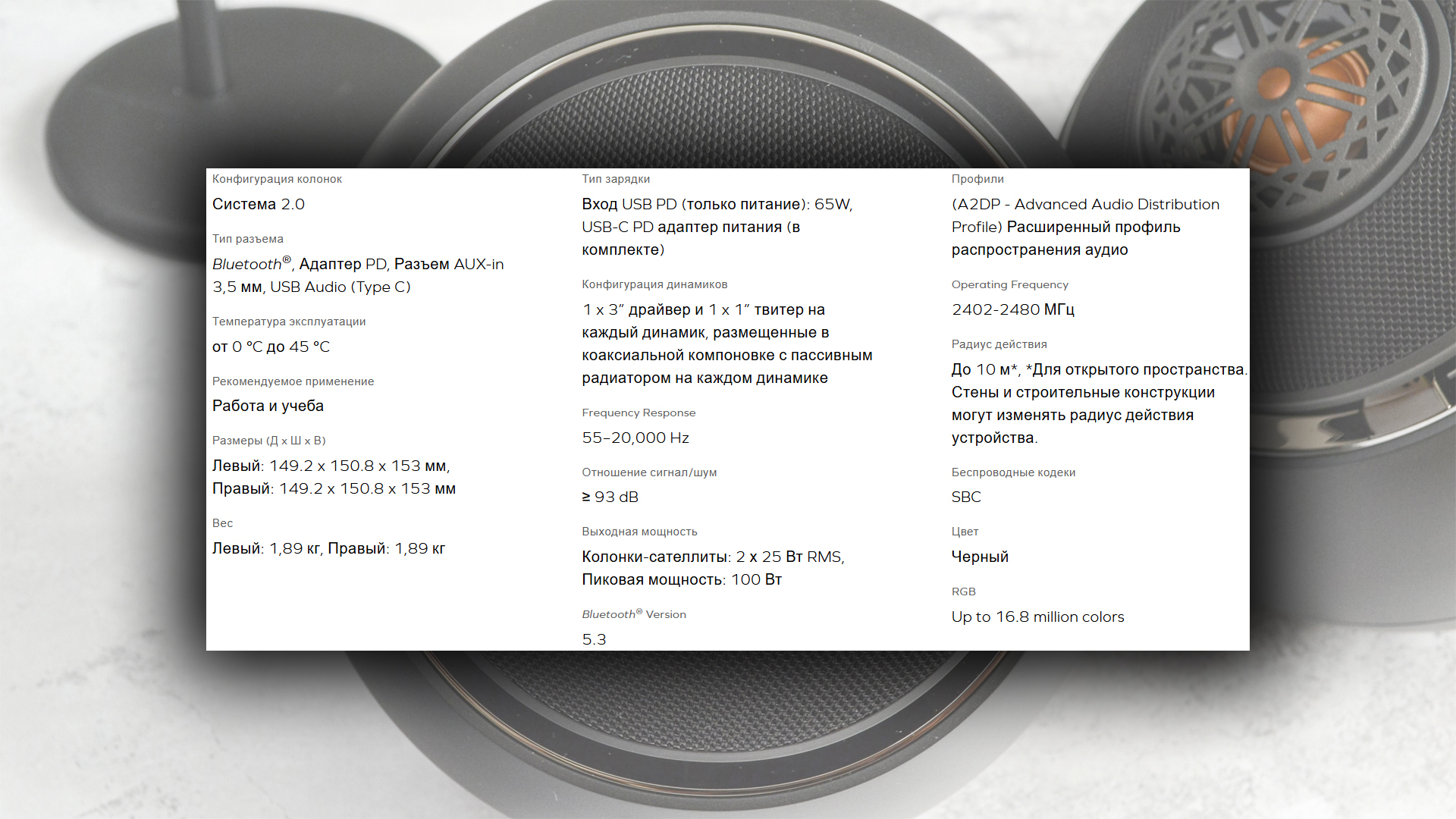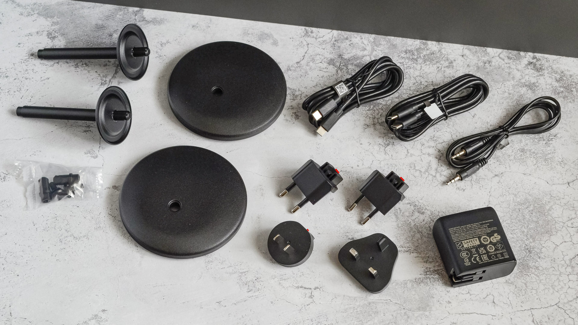 Комплект поставки включается в себя две подставки с комплектом крепежа, три кабеля (два USB-C и AUX) и универсальный адаптер питания со сменными вилками.