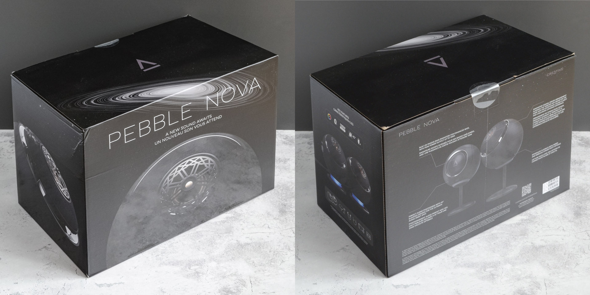 Поставляются Creative Pebble Nova в коробке довольно внушительных размеров. Визуально оформление коробки очень приятное и выполнено преимущественно в черном цвете с элементами космической тематики.