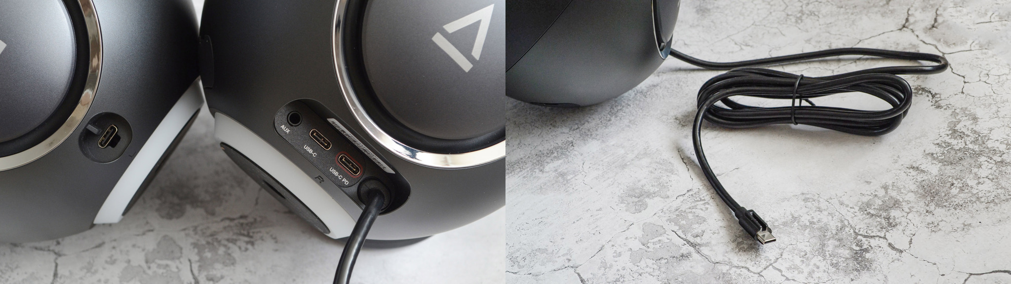 На этой же правой колонке, но ближе к подошве размещен несъемный провод USB-C с фиксированным ключом (вверх ногами не подключишь) для соединения со второй колонкой, а также разъемы: пара USB-C (один для питания, второй для звука) и AUX. Помимо этого, источником звука может быть и Bluetooth. В зависимости от источника звука индикатор меняет цвет: