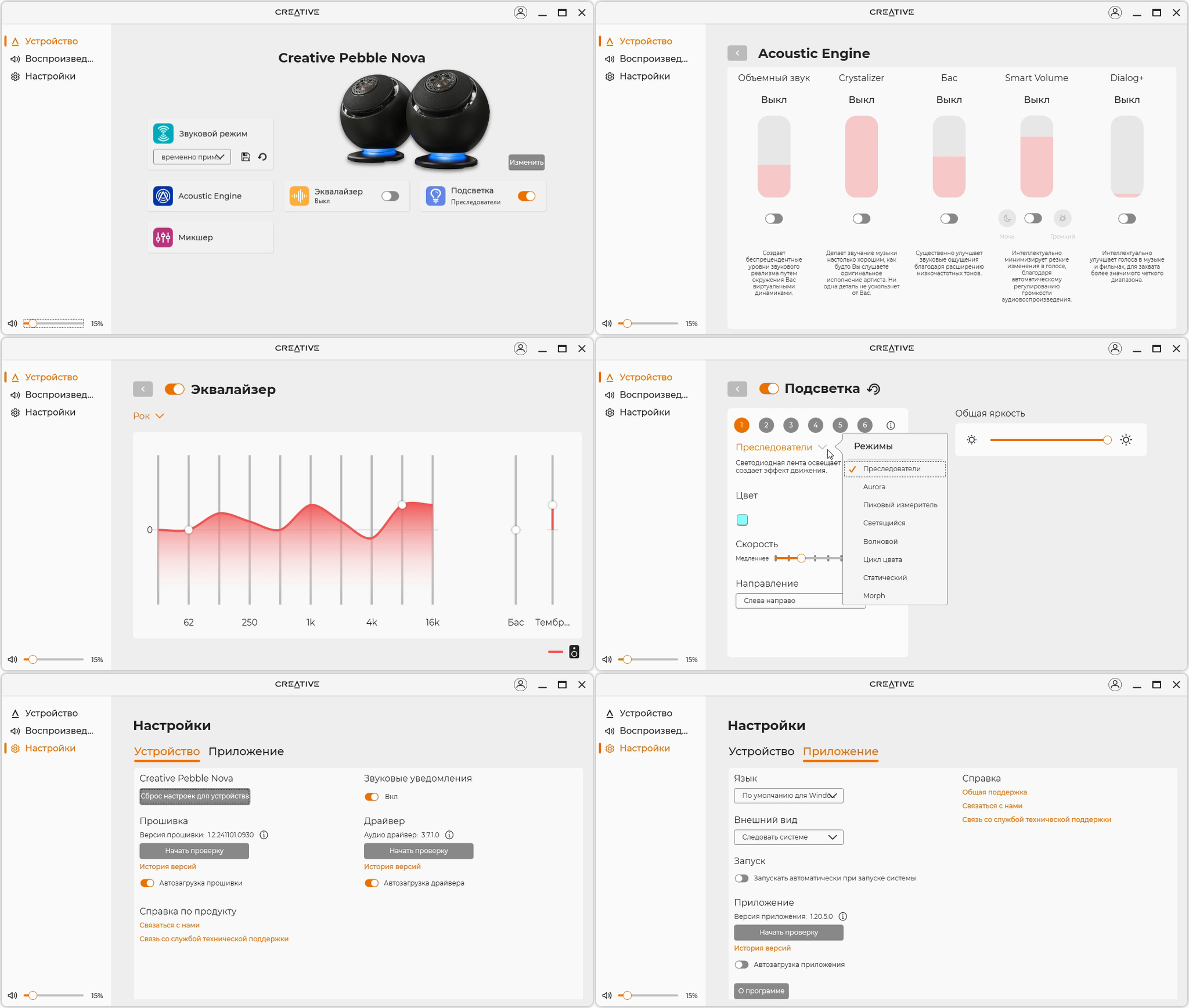 На официальном сайте производителя доступно приложение Creative App. Оно позволяет настроить звук с помощью классического эквалайзера или использовать Acoustic Engine для активации звуковых «улучшалок», уровень которых можно подкрутить самостоятельно. Также в приложении можно обновить драйвера и саму прошивку колонок и управлять подсветкой: выбирать эффекты, регулировать скорость и яркость. Кроме того, здесь же можно обновить драйвера устройства.