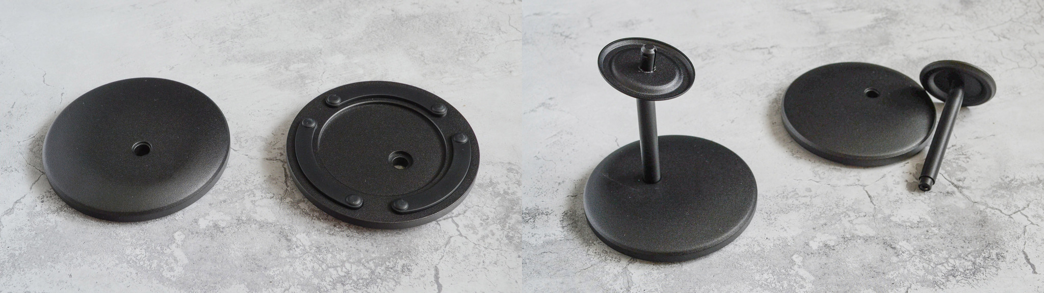 Отдельного внимания заслуживают подставки. Они плоские, целиком металлические и очень увесистые. Сама конструкция представлена двумя деталями: опорной «пятой» и ножкой. Между собой эти детали скрепляются комплектными винтами.