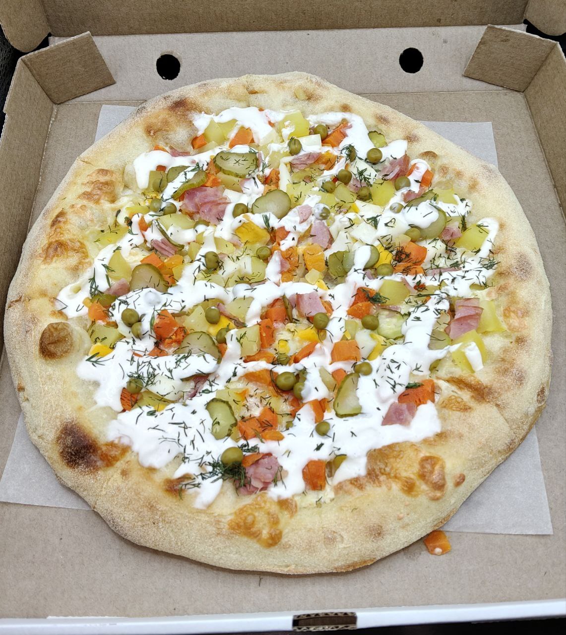 Это обычные ингредиенты для салата оливье на вкусном тесте, политые чесночным самодельным соусом. Задумка интересная, а её реализация удалась только благодаря хорошо подобранным, свежим продуктам. По большому счёту ты ешь оливье с хлебом, во рту и мозгу нет диссонанса, я бы съела отдельно это как салат и основа пиццы могла бы послужить лепёшкой. Лично для меня это не кринжовая история, а съедобная пицца, тоже рекомендую.