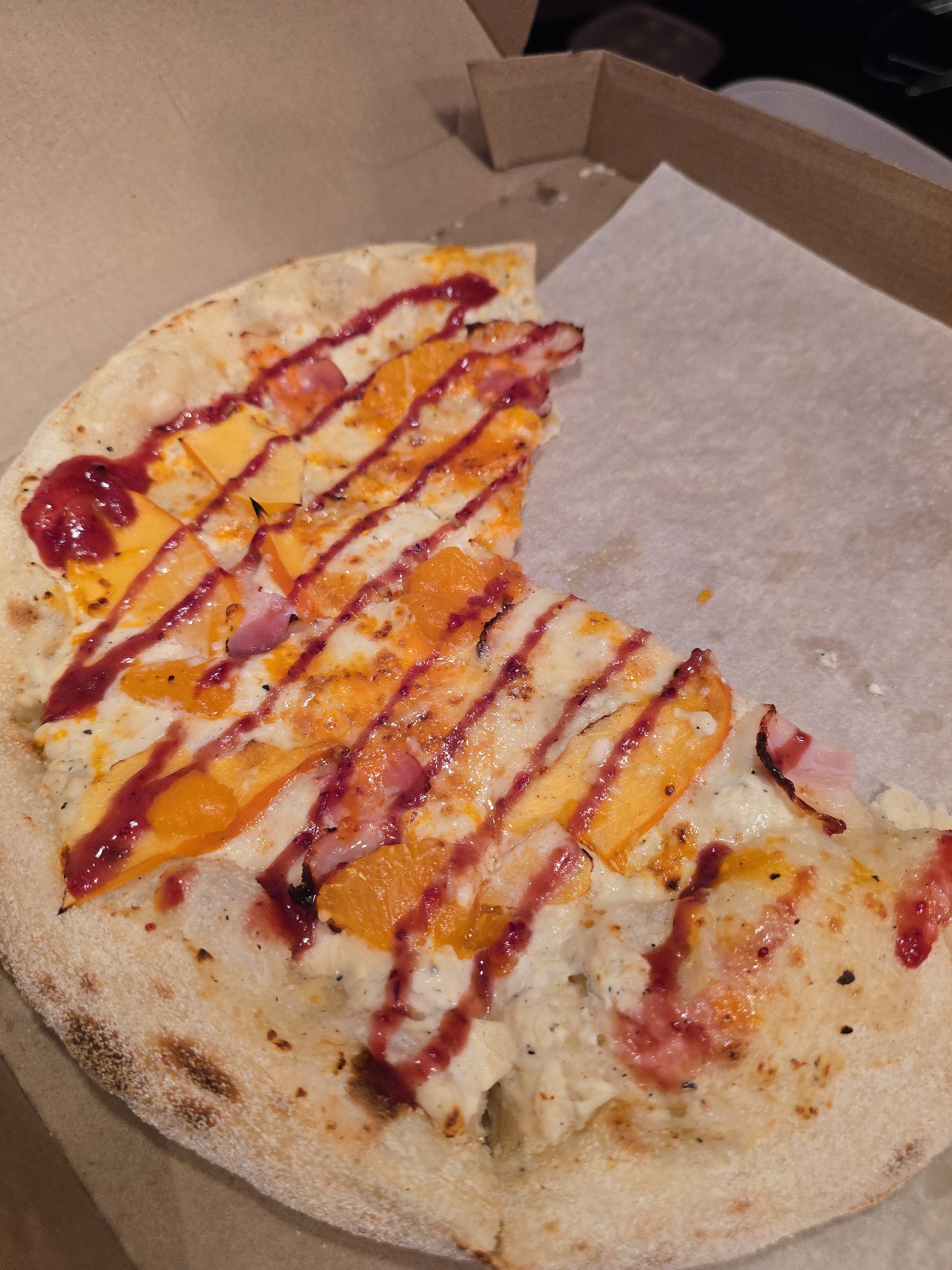 Это обычные ингредиенты для салата оливье на вкусном тесте, политые чесночным самодельным соусом. Задумка интересная, а её реализация удалась только благодаря хорошо подобранным, свежим продуктам. По большому счёту ты ешь оливье с хлебом, во рту и мозгу нет диссонанса, я бы съела отдельно это как салат и основа пиццы могла бы послужить лепёшкой. Лично для меня это не кринжовая история, а съедобная пицца, тоже рекомендую.