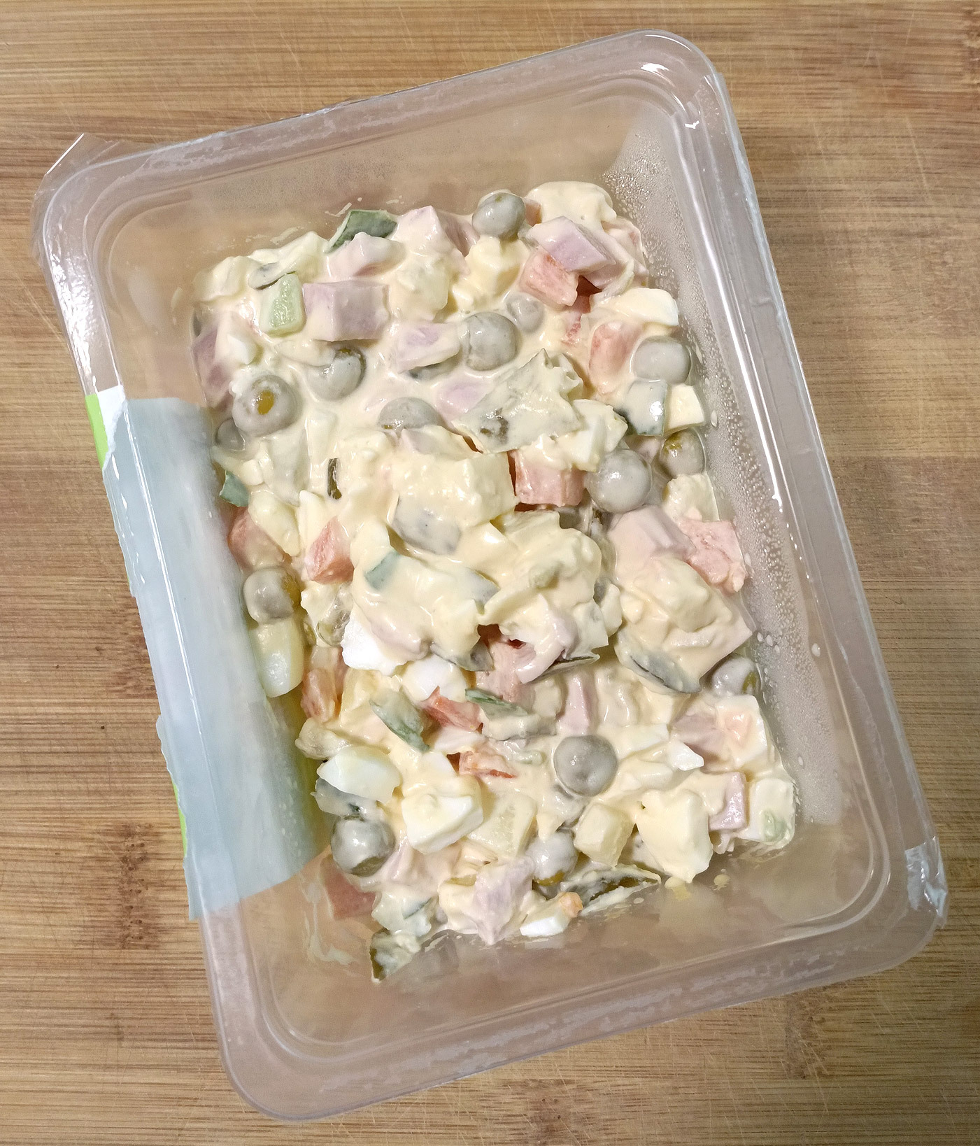 Всё какое-то скучное, картофель вообще максимально пресный и слегка недоваренный, общее впечатление на тройку с минусом. С правильно приготовленным домашним «Оливье», конечно же, не идёт ни в какое сравнение. Так что если вдруг решите загрузить в себя почти 300 Ккал за 140 руб., не получив при этом никакого удовольствия — отличный вариант, но я не рекомендую.