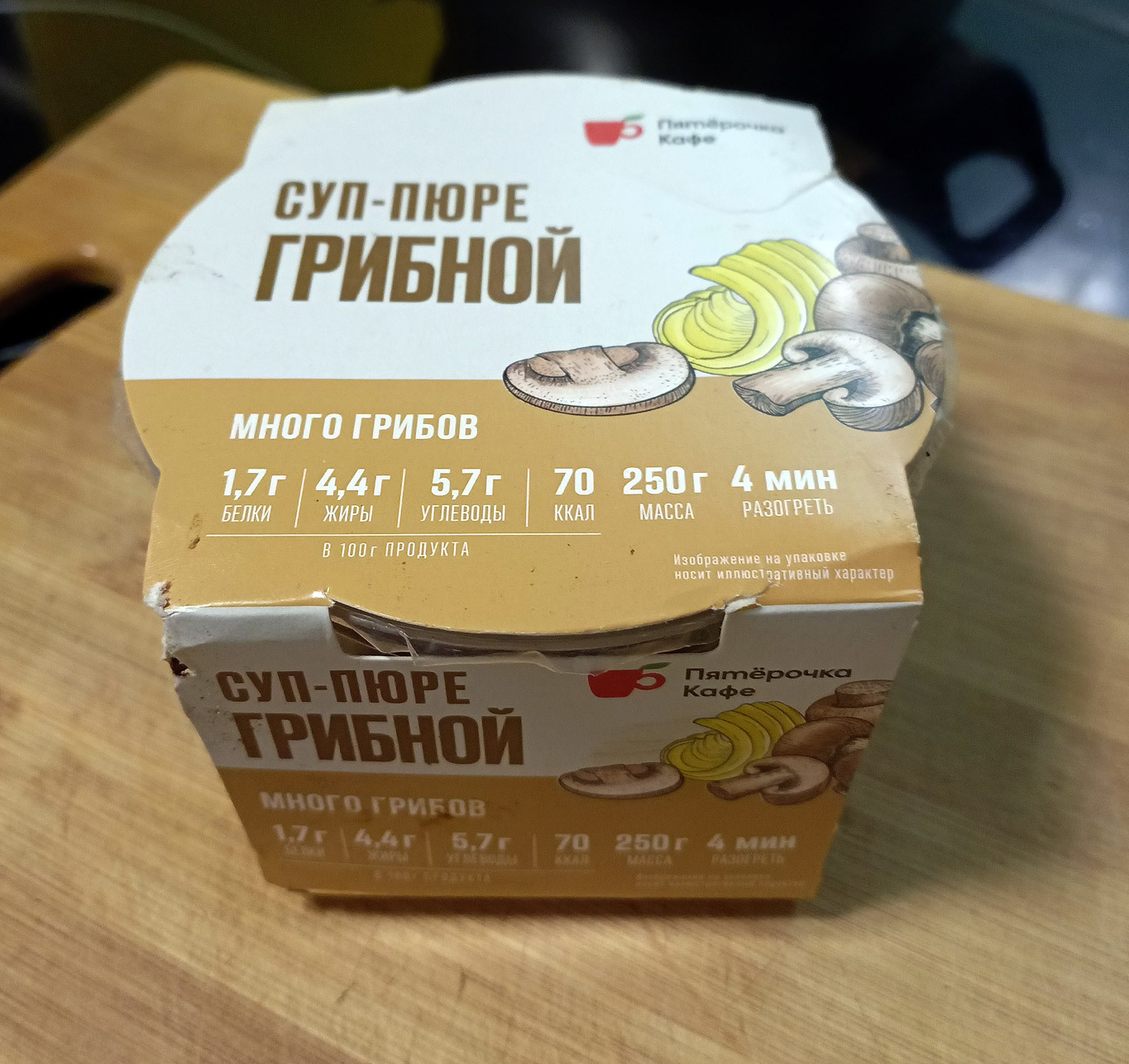 Сразу хочу указать производителю на ошибку: в составе присутствуют сливки, а в таком случае это уже не суп-пюре, а крем-суп. Впрочем, это придирка исключительно к терминологии. В остальном — претензий никаких: это вполне съедобный и вкусный суп, консистенция не слишком густая, текстура бархатная, вкус грибов выражен, ощущение сытости после употребления присутствует. Калорийность более чем в рамках приличия — 175 Ккал на порцию, а вот цена в 160 руб. понравится не всем.