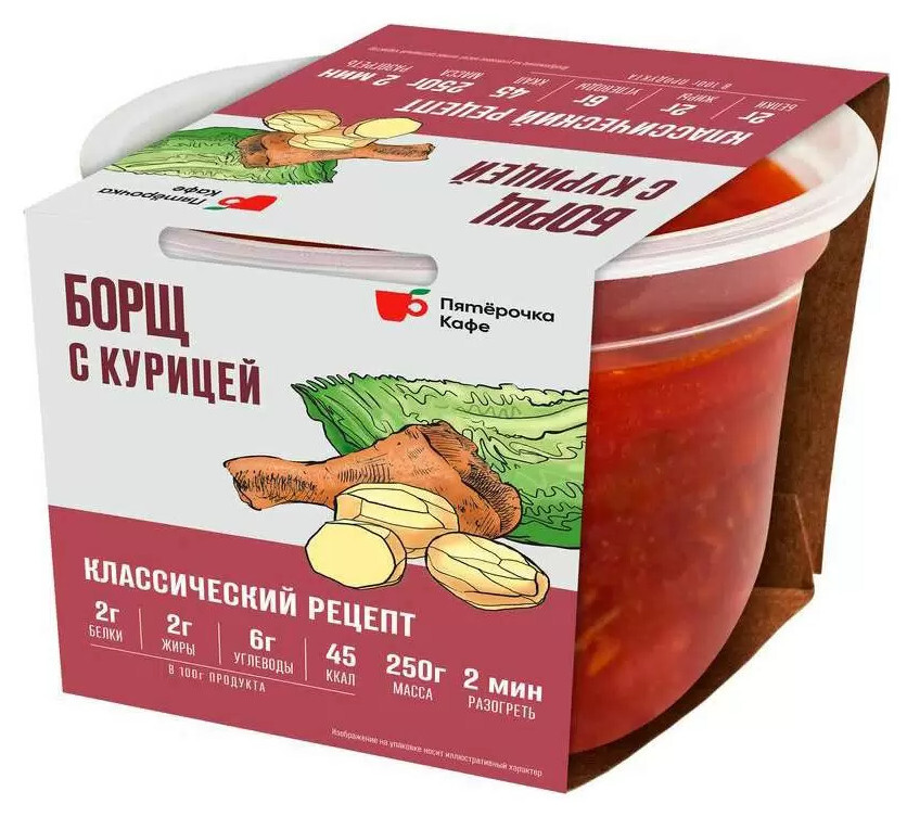Скажем так: суп похож на борщ — у него есть цвет и вкус, определённая густота, попадаются кусочки мяса, но это всё же из разряда «похлебать жиденького». Порция откровенно маловата, мужику ей наесться не получится, однозначно придётся дополнить обед чем-нибудь посытнее, вроде котлетки с пюрешкой.