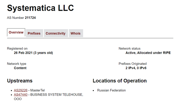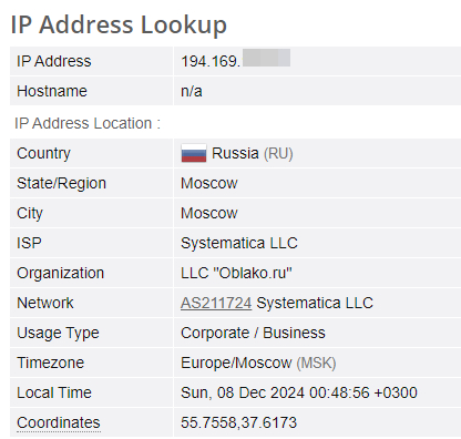 У меня был ip: 194.169.** .** согласно данным из открытых источников ip закреплено за Systematica LLC – AS211724
