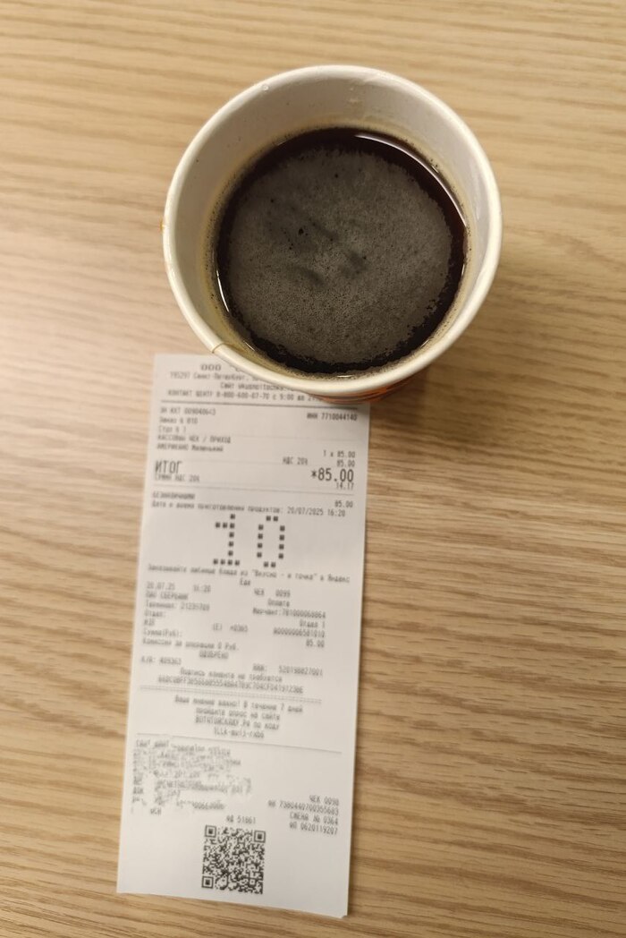 Ну это уже плохо, как будто кофе из Subway или ДоДо разбавили водой. Как раз до этого я зашла в "Окей" за напитком, который смоет накопившуюся горечь от предыдущих чашек кофе и попробовав напиток во Вкусно — и точка, я не почувствовала почти ничего, просто подкрашенная вода.